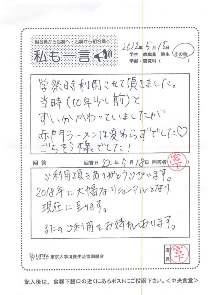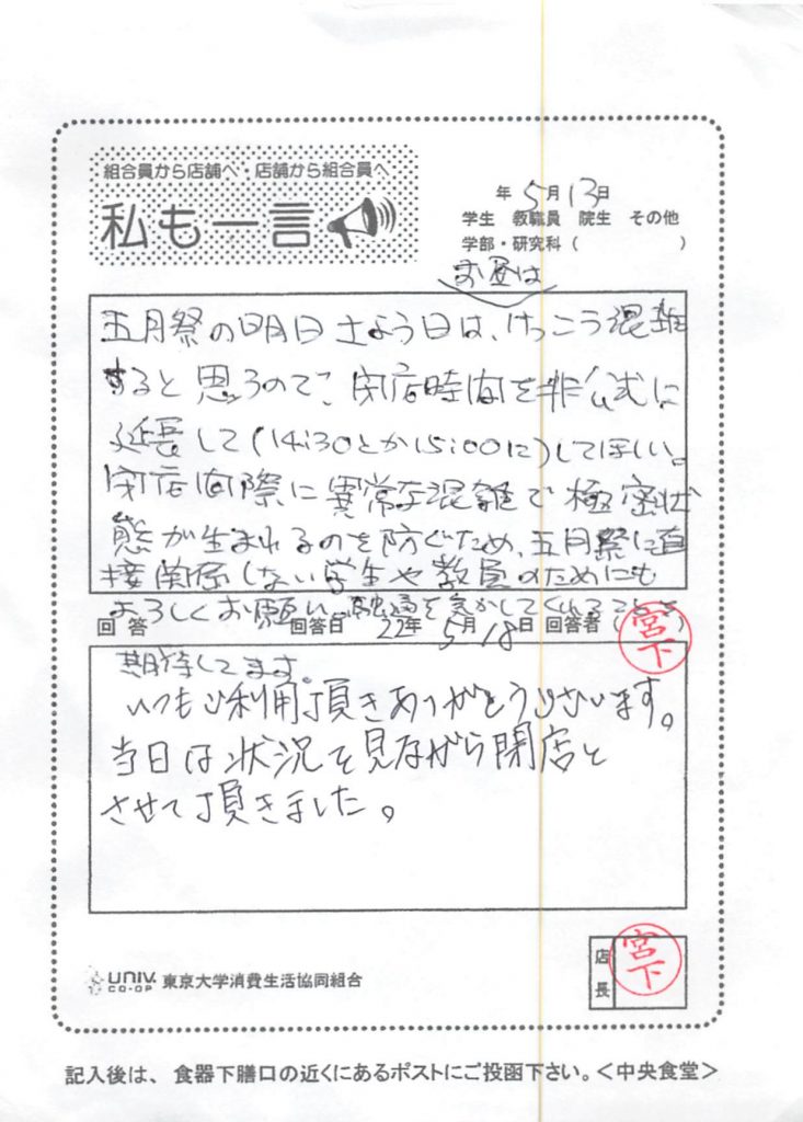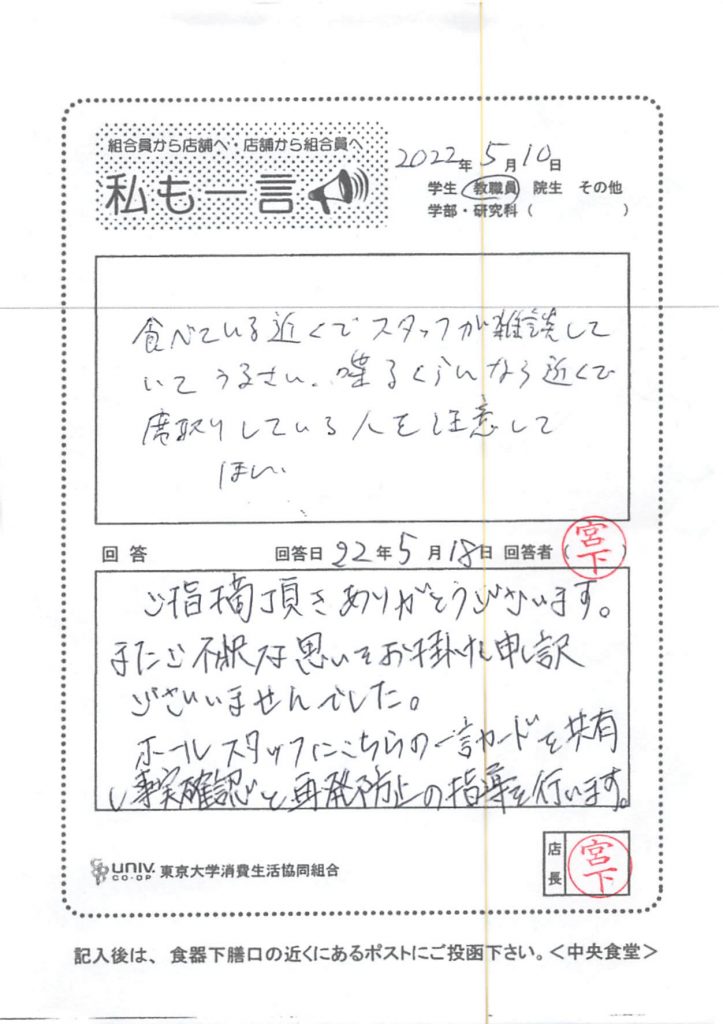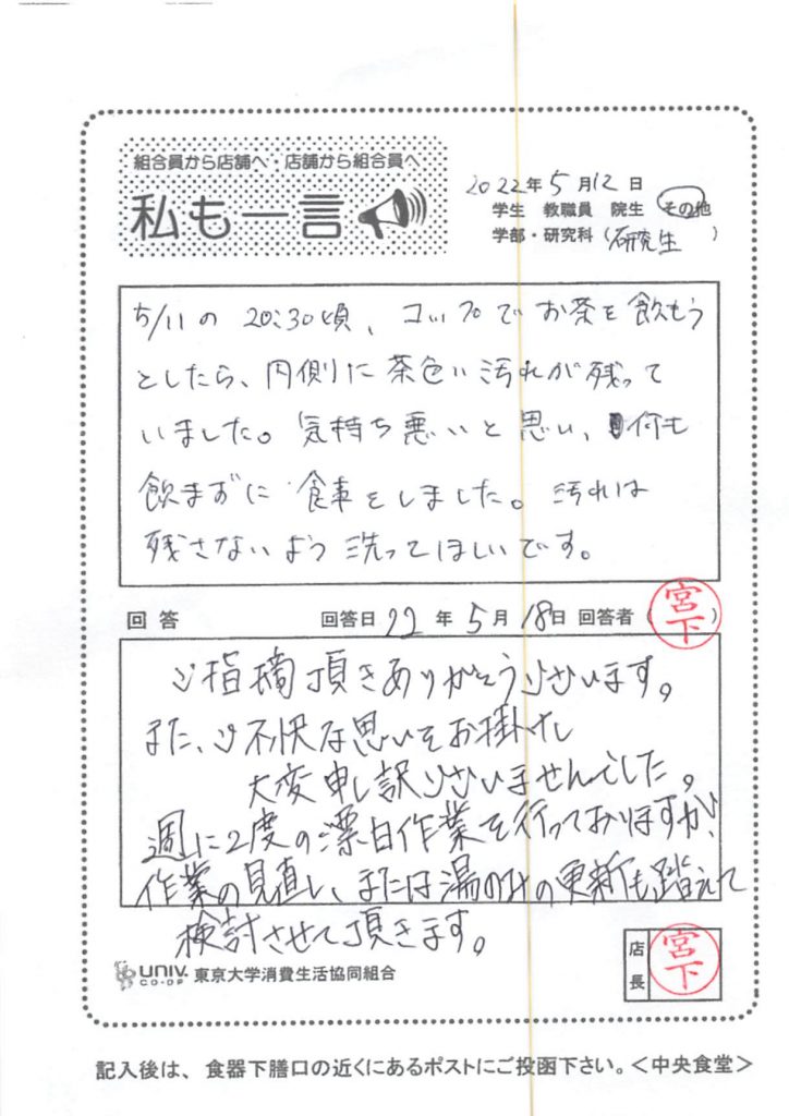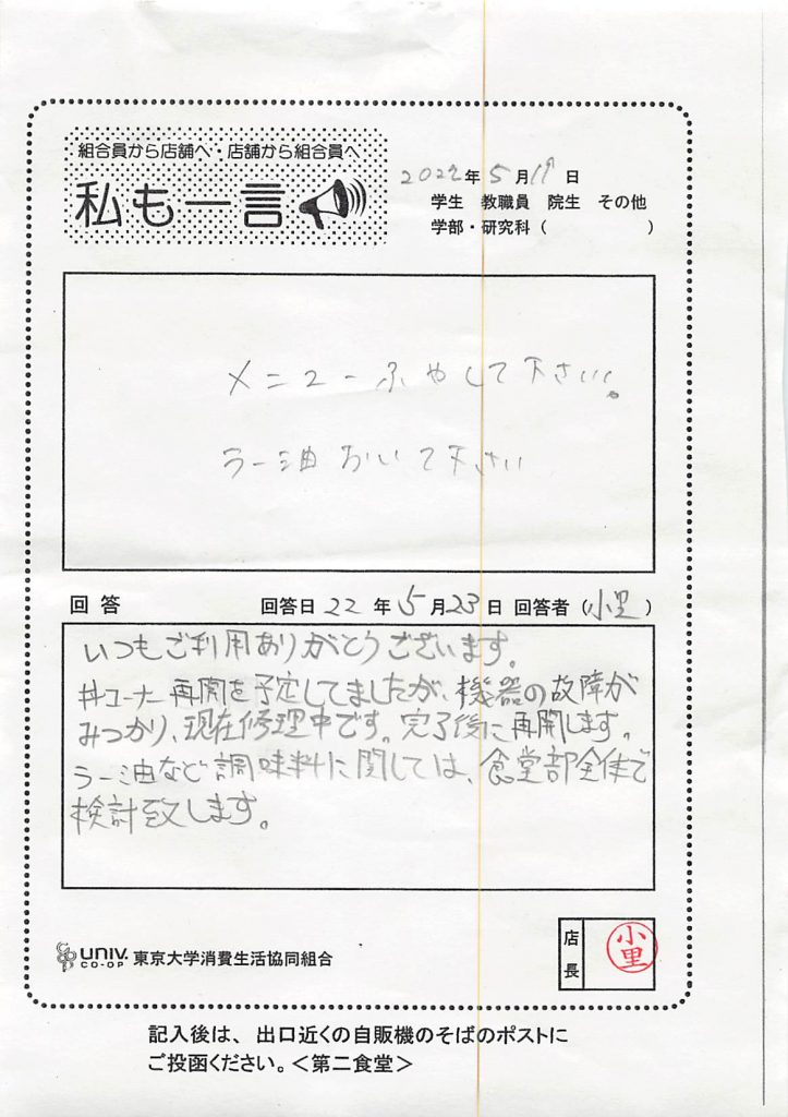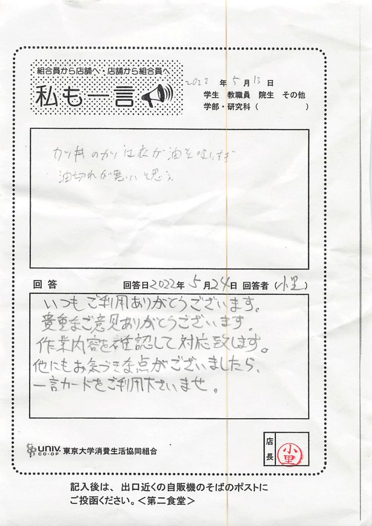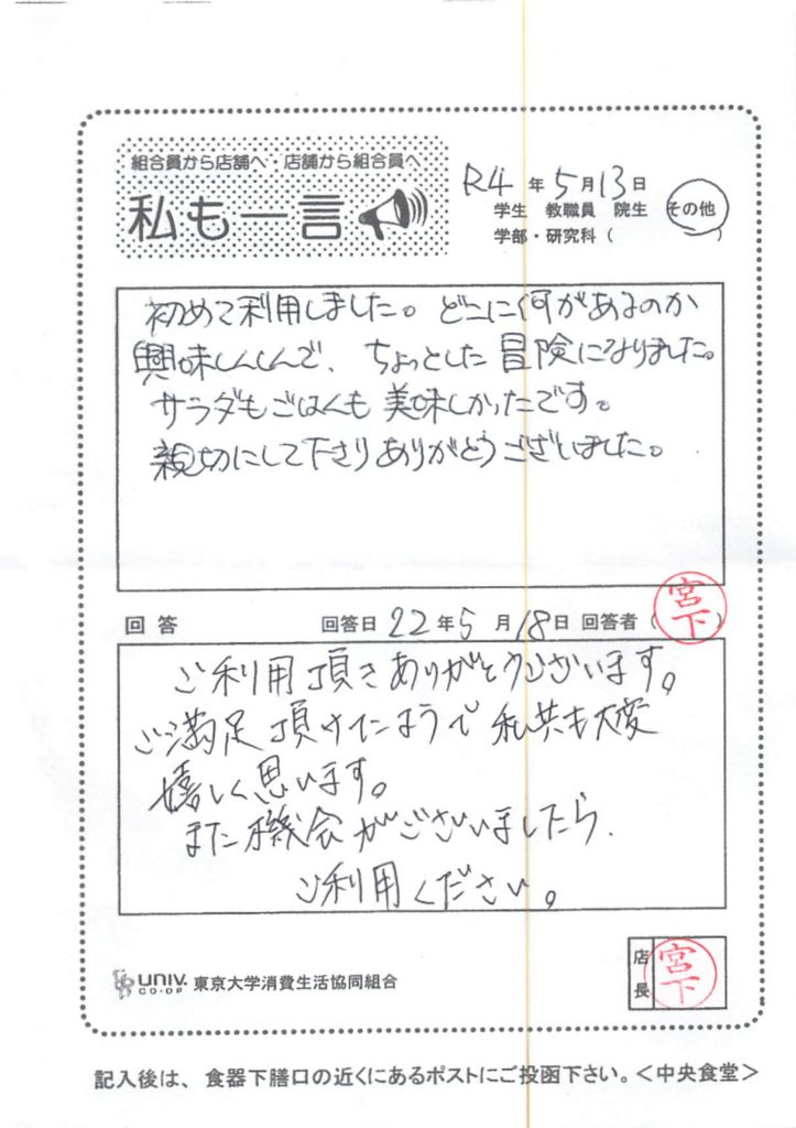 次にハンバーグについてです。「ハンバーグデミソース」で使用している「ハンバーグ」は大学生協全体で使用している食材になります。こちらのご意見をメニューや食材について全体で協議する場で、共有させて頂きます。早急な改善になることがお約束できませんので、先にお詫び申し上げます。