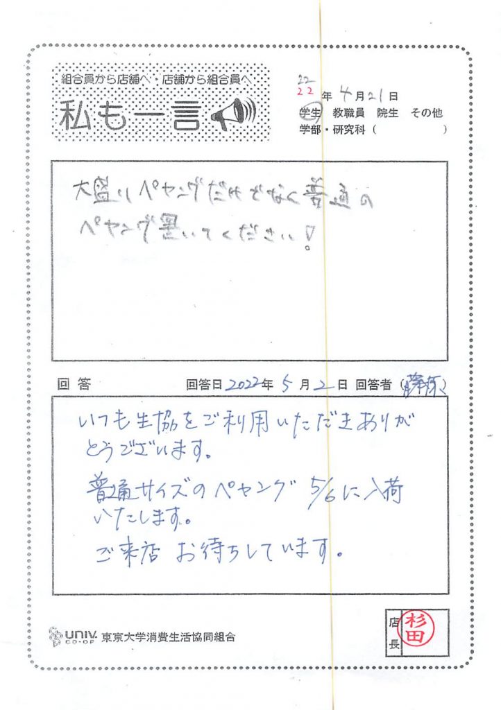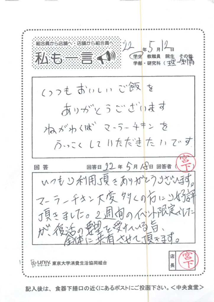 「タンメン」ご賞味頂きありがとうございます。お褒めの言葉大変うれしく思います。第二食堂や農学部食堂での「タンメン」の提供ですが、第二食堂では今後、農学部食堂では日替わりで提供しておりました。