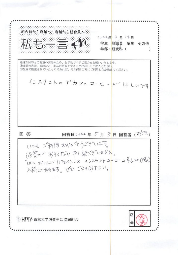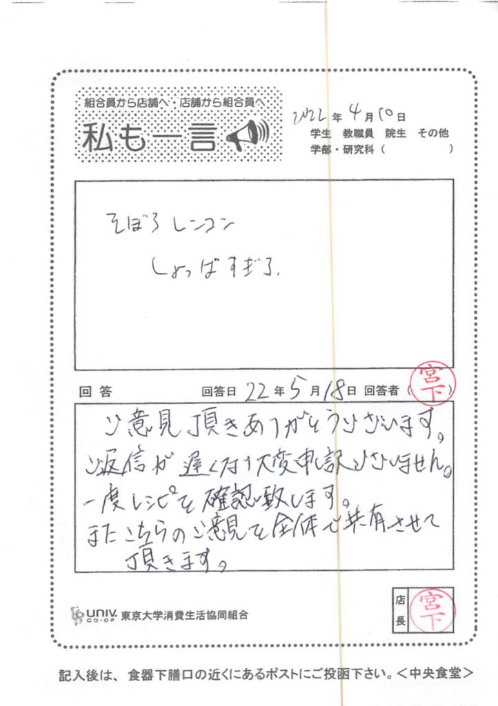 また「野菜炒め」の提供ですが、中央食堂では来週1週間限定で「豚野菜うま塩炒め」をカフェテリアコーナーで提供予定です。是非ご賞味ください。その後も要望を多く頂きましたら、復活提供も検討いたします。