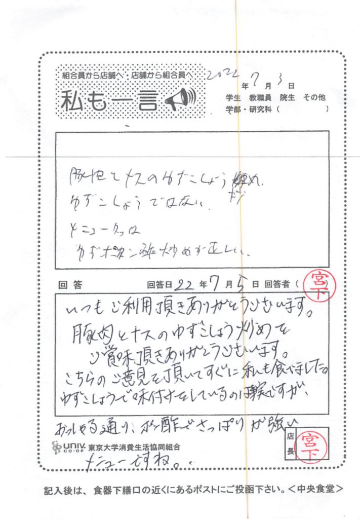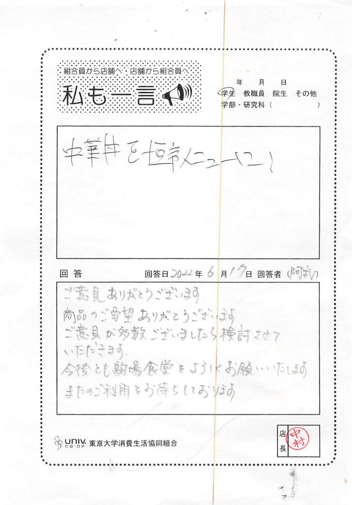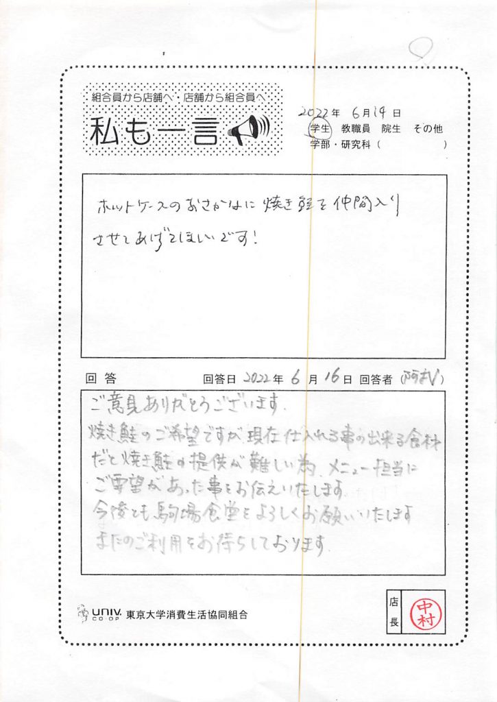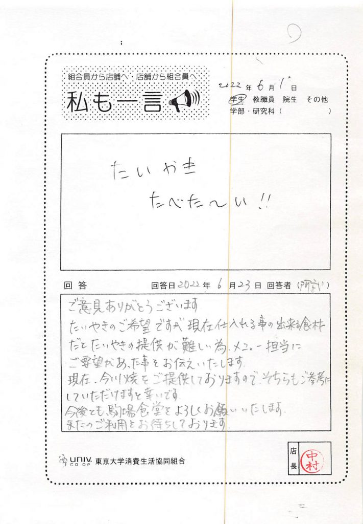 駒場食堂2階のオークスの玄米カツ丼がもう一回食べたいです。今までで一番好きなカツ丼です!10月からは駒場キャンパスには来なくなるので、7月中に食べたいです!ご検討いただけると幸いです。大変恐縮ですが、何卒よろしくお願いいたします。