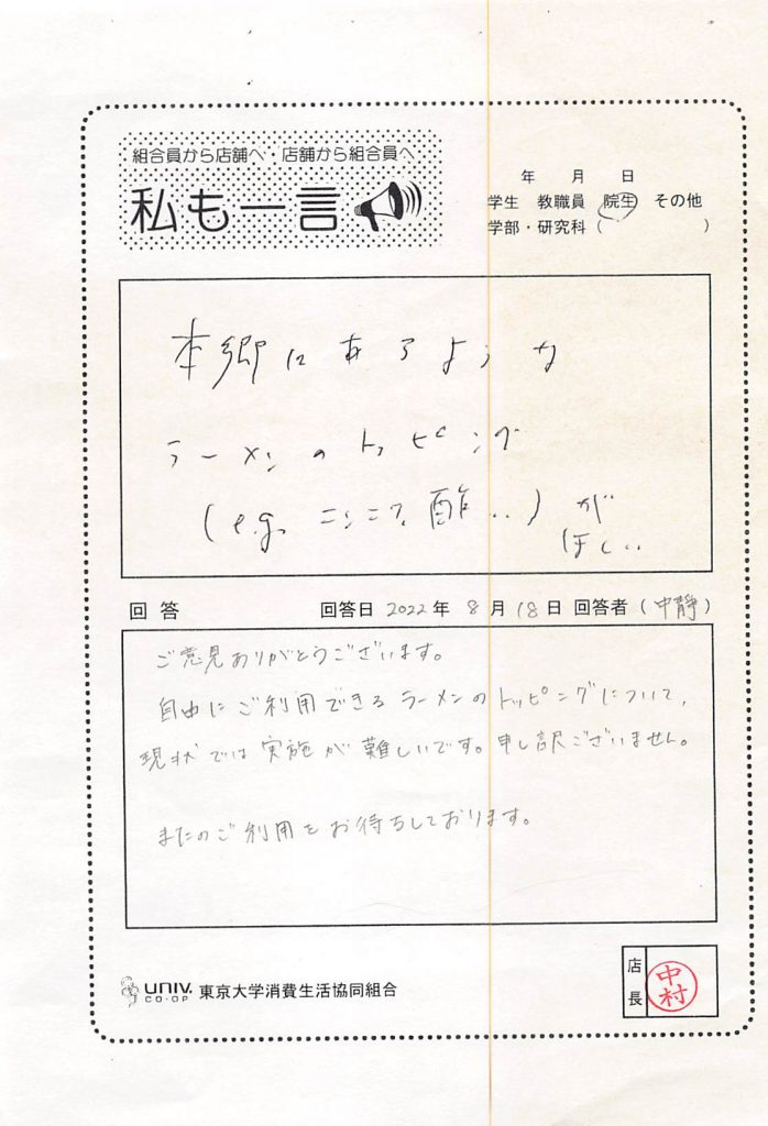 本郷にあるようなラーメンのトッピングがほしい・・・