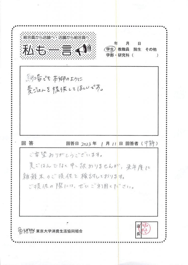 麦ごはんを提供してほしい・・・