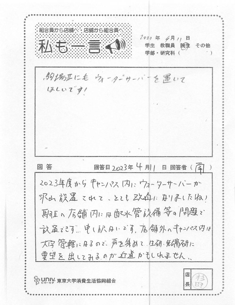 駒場Ⅱにもウォーターサーバーを置いて・・・