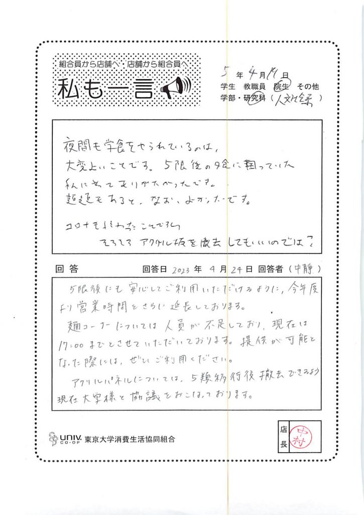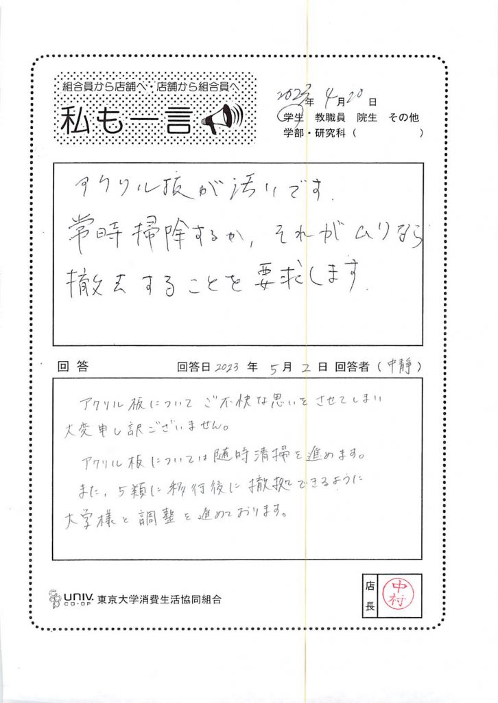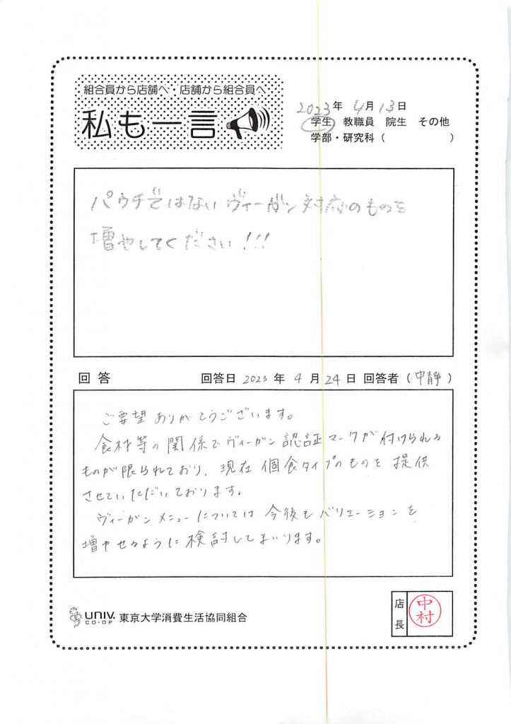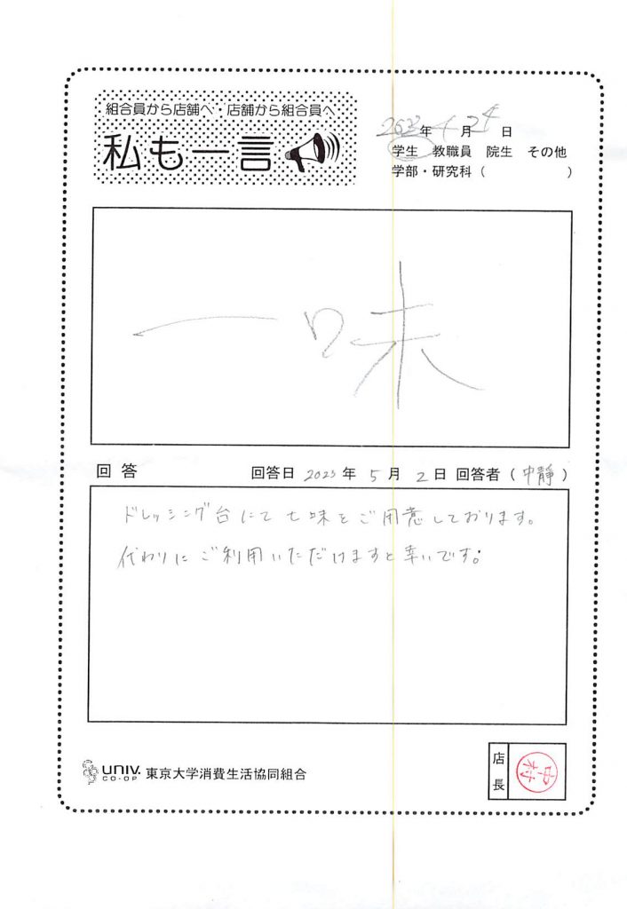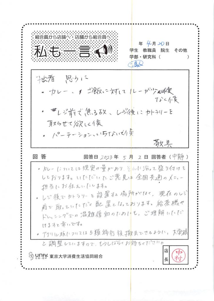セルフバーの運用に関しまして・お皿の重さは計量の際に引いております。値段には換算しておりません。・g当たりの単価は東大生協で共通価格となっております。