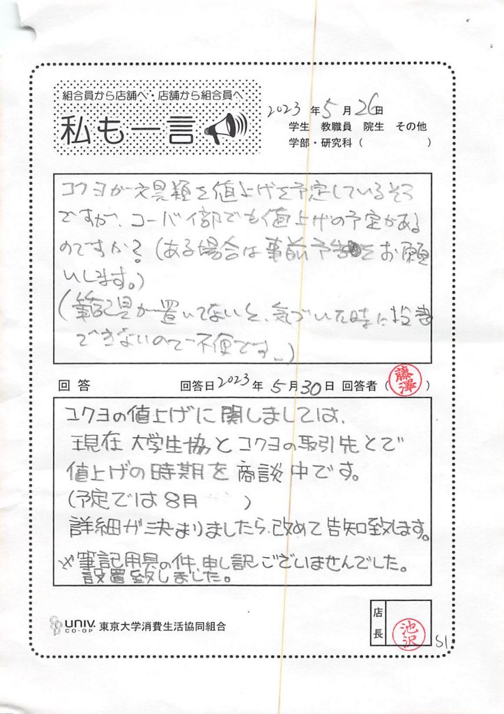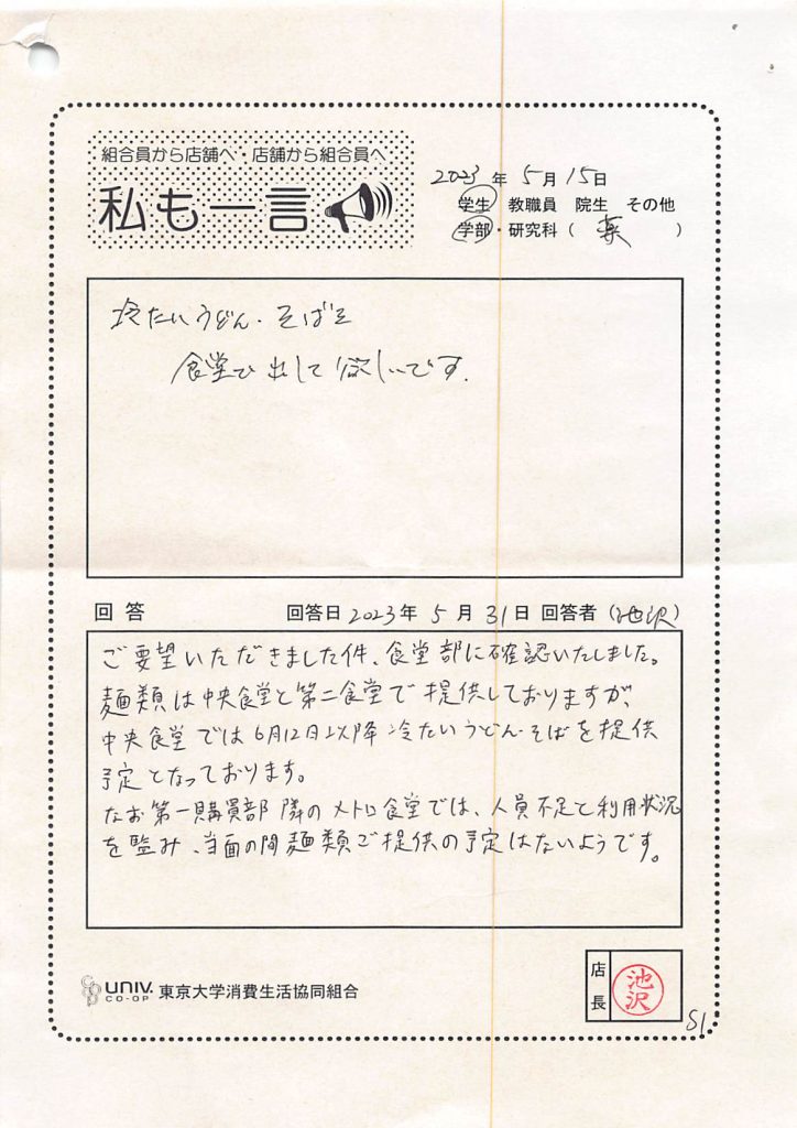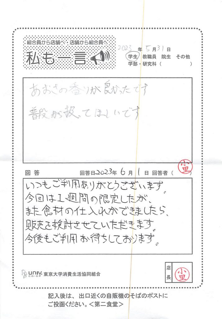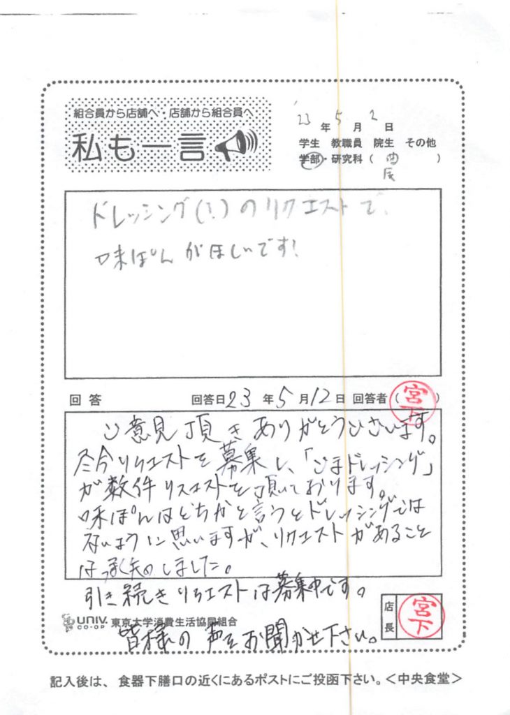 また、こちらの周知が十分でなかったため、いただきましたご意見を受け止め食堂出入口に学食ドットコープご案内のポスターを掲示させていただきます。