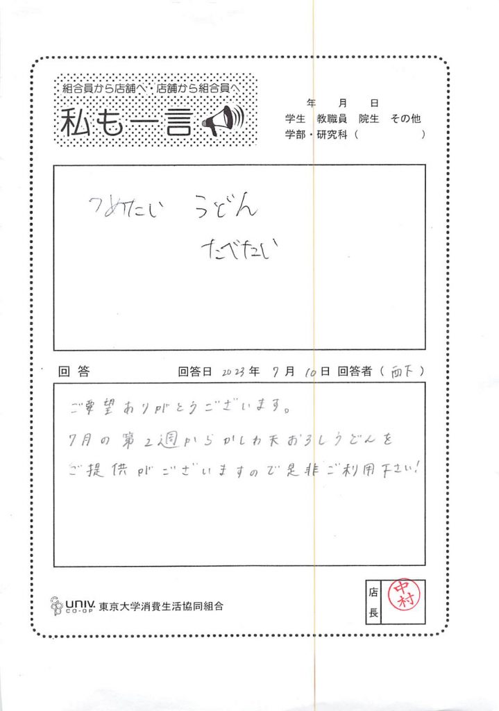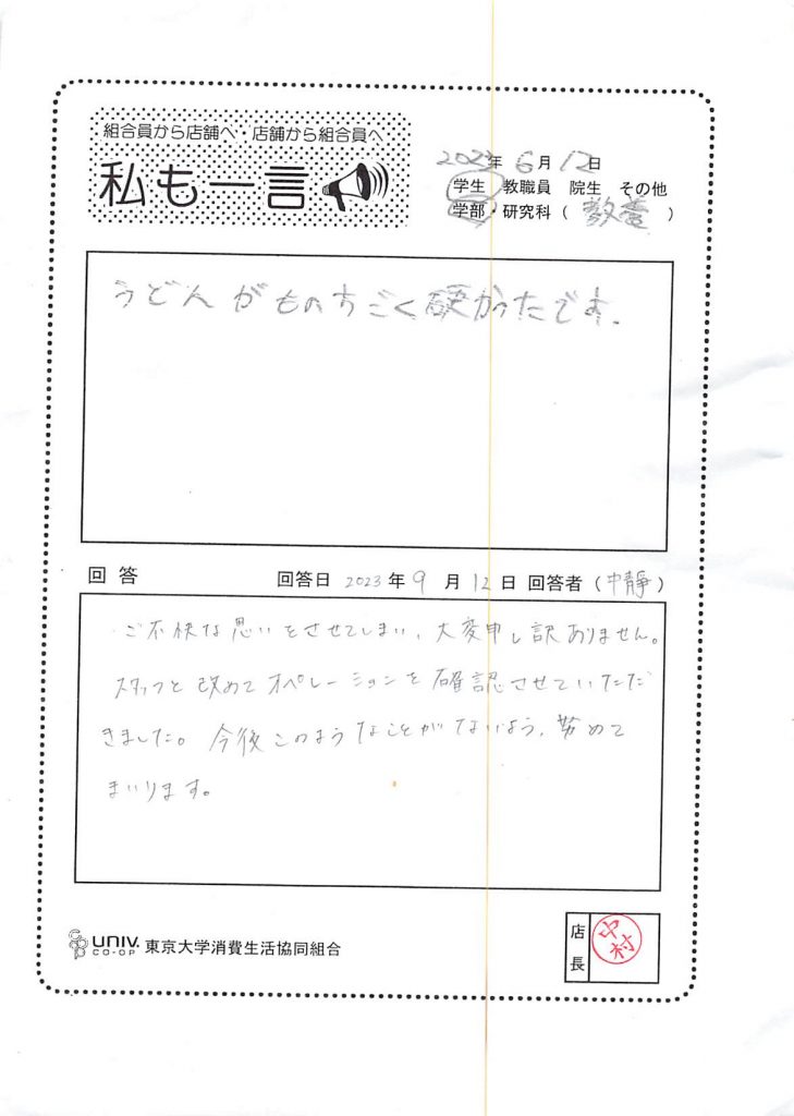 オンライン投稿弥生・浅野 20239/19 「もちもちクレープ・蜜芋」を浅野店でも・・・ Q: 第二購買部で売っている「もちもちクレープ・蜜芋」を浅野店でもうってほしいです。 A: 「もちもちクレープ・蜜芋」ですが、来週から浅野店でも販売いたします。是非ご利用ください。 Tweet