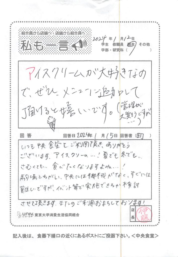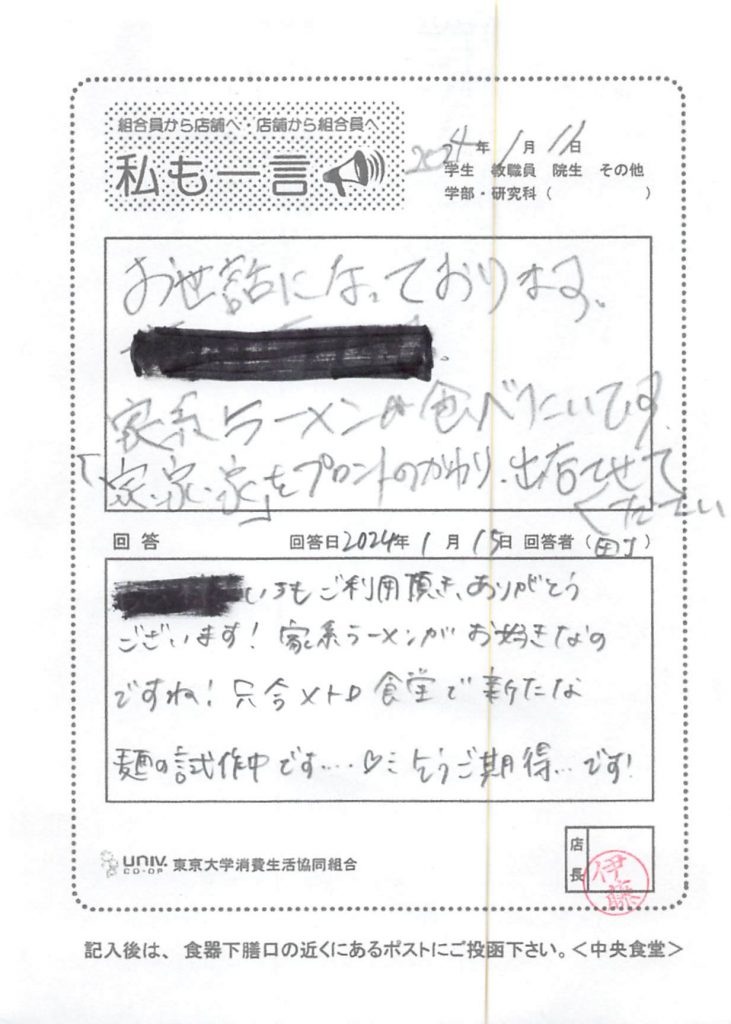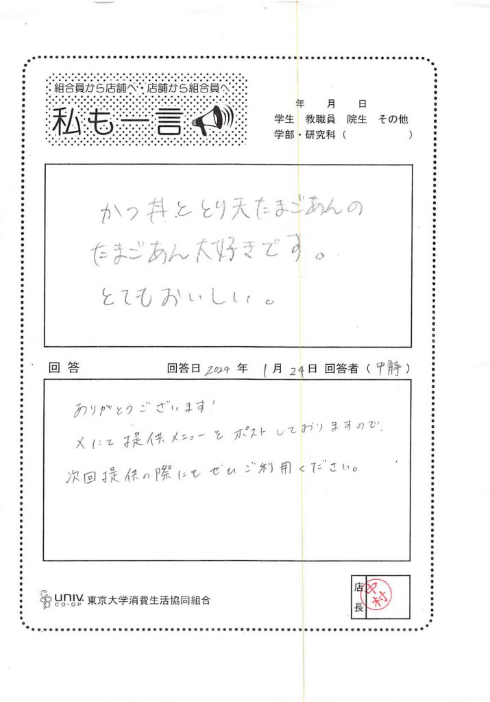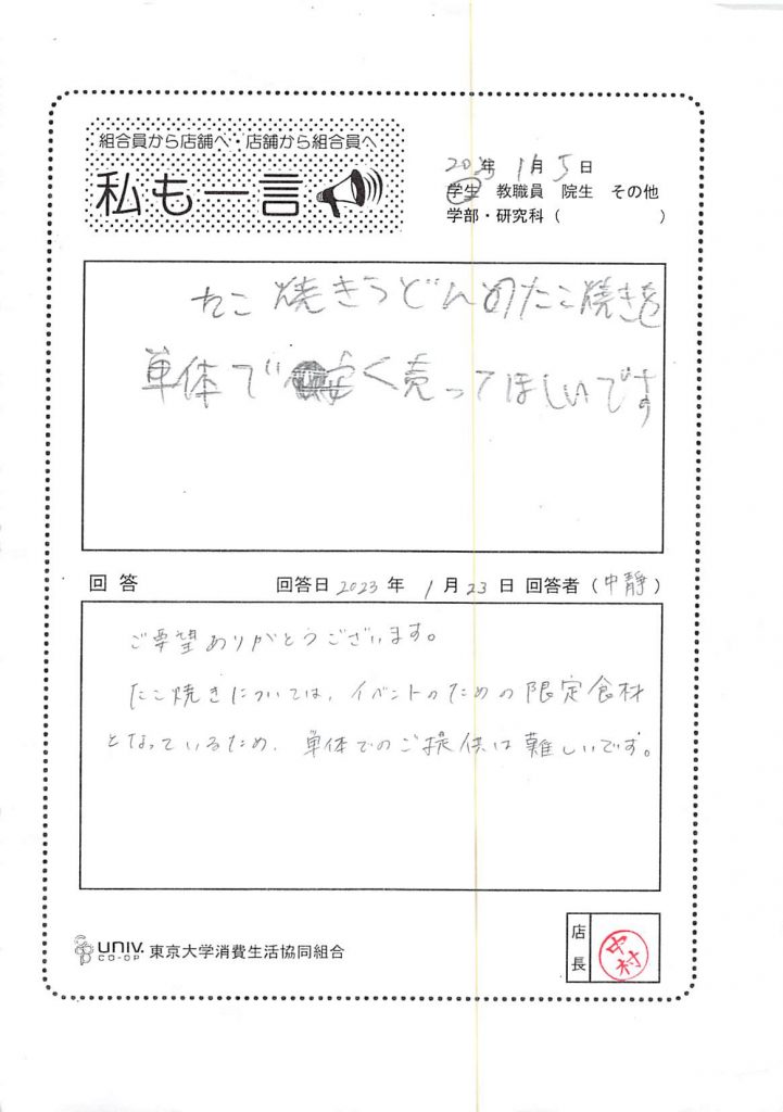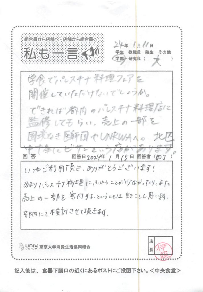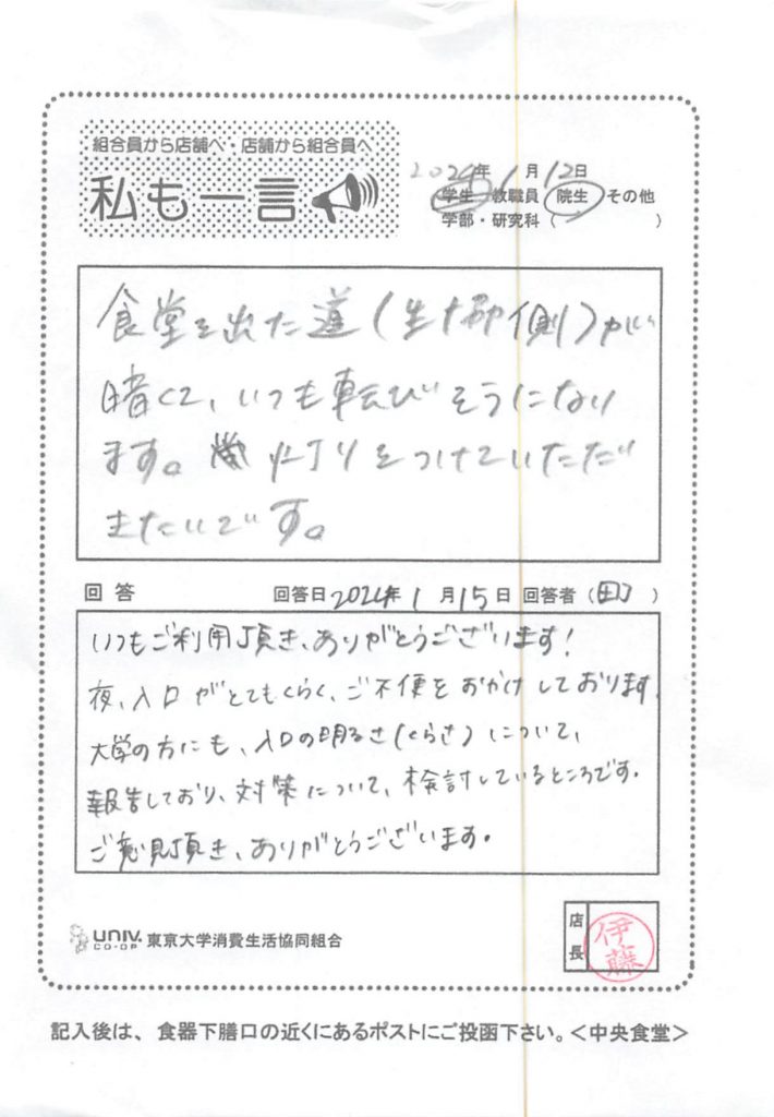 トイレの場所をわかりやすくしたほうがいいと思います。案内の掲示を学外向けに出したほうがいいです。