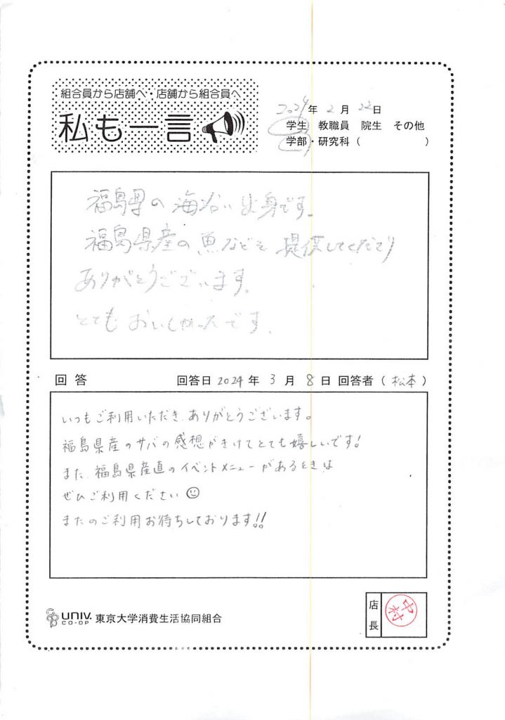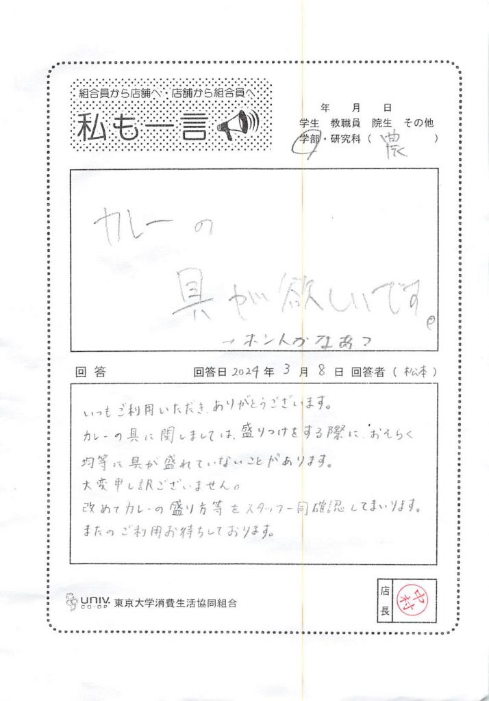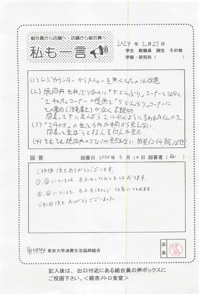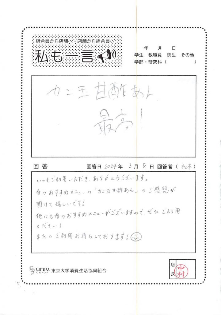オンライン投稿医科研 20243/14 医科研食堂のメニューをオンラインで見れるのはありがたいのですが・・・ Q: 医科研食堂のメニューをオンラインで見れるのはありがたいのですが、画質が悪すぎて読めません。改善お願いいたします。 A: なるべく画素数をあげて投稿するよう次回から致します。 Tweet
