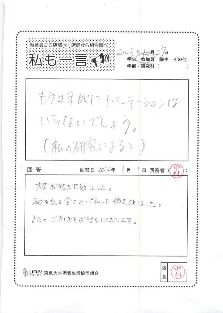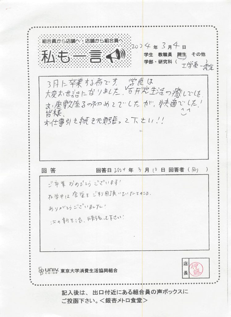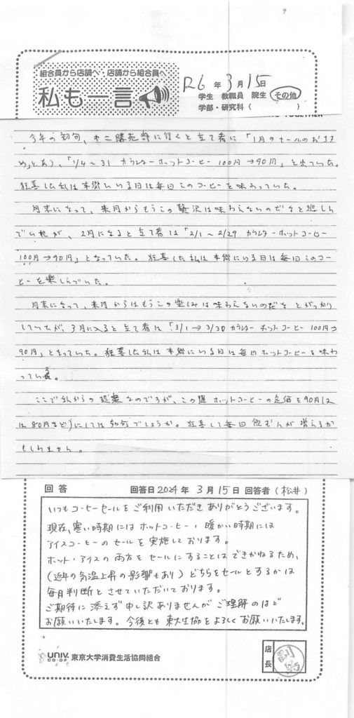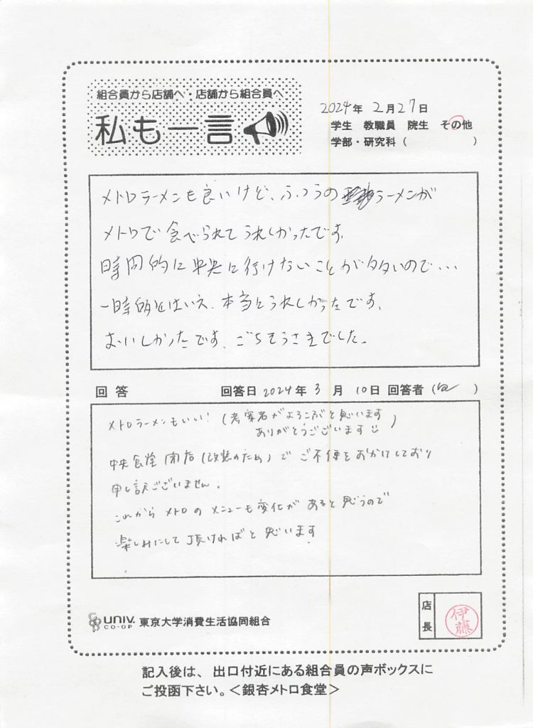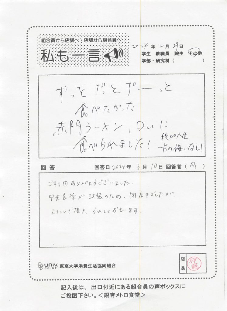 オンライン投稿医科研 20243/14 医科研食堂のメニューをオンラインで見れるのはありがたいのですが・・・ Q: 医科研食堂のメニューをオンラインで見れるのはありがたいのですが、画質が悪すぎて読めません。改善お願いいたします。 A: なるべく画素数をあげて投稿するよう次回から致します。 Tweet