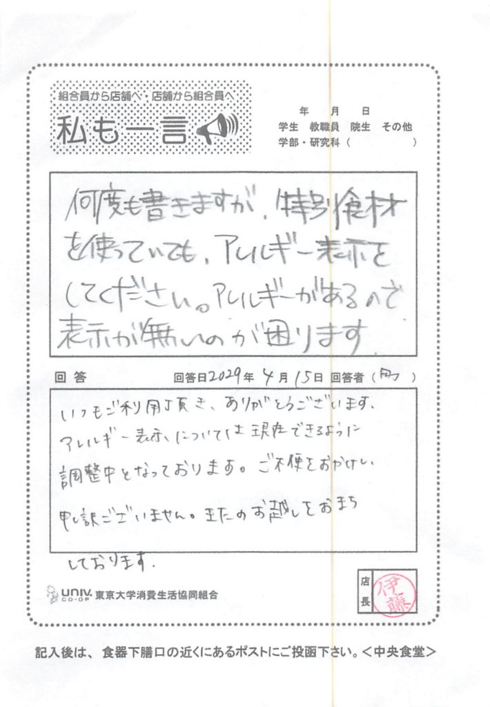 特別食材を使っていても、アレルギー表示をしてください・・・