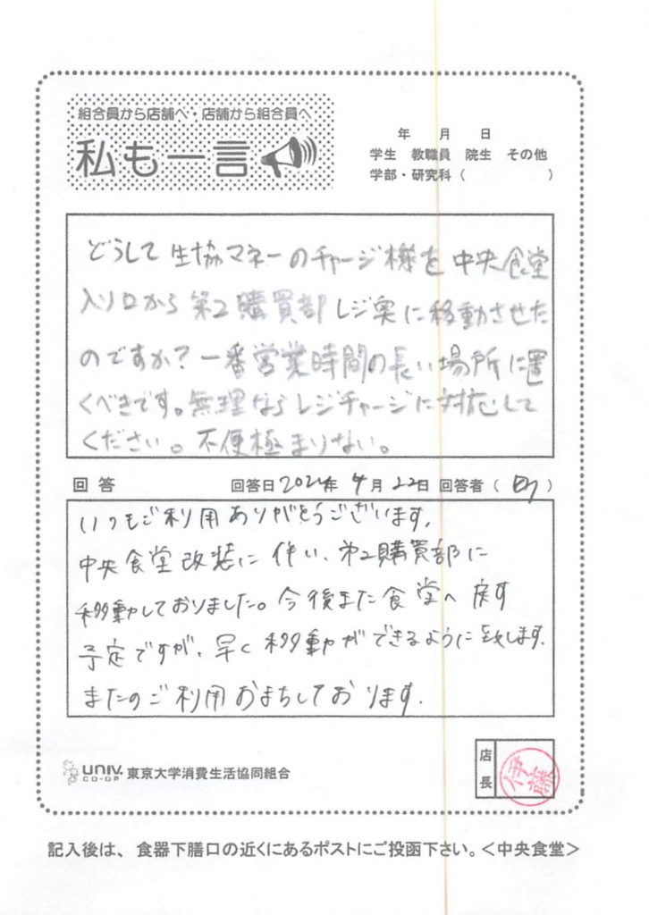 どうして生協マネーのチャージ機を中央食堂入り口から・・・