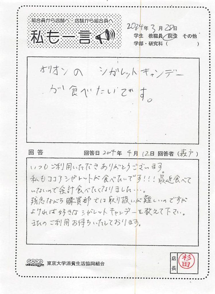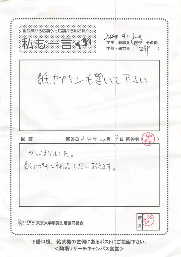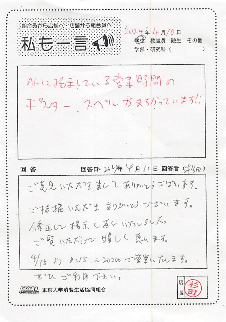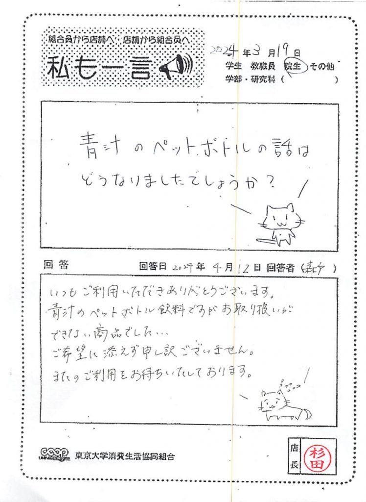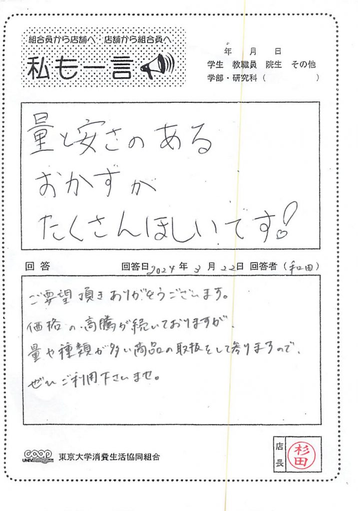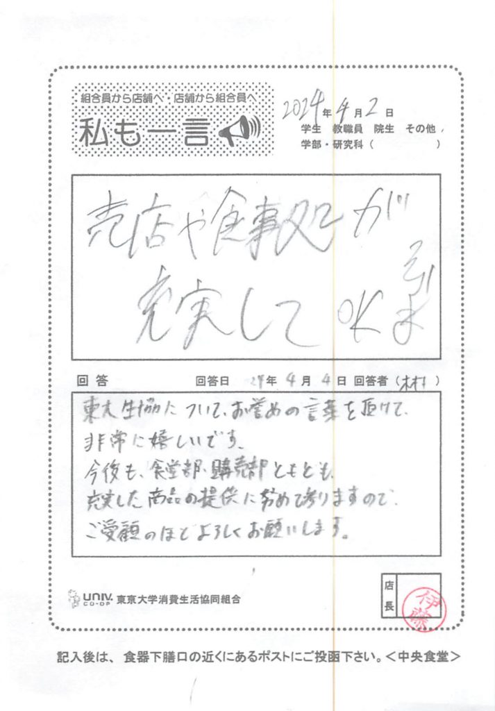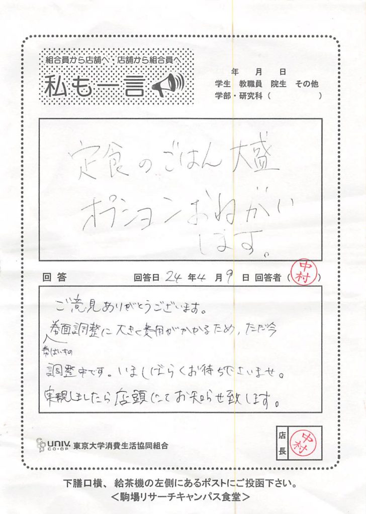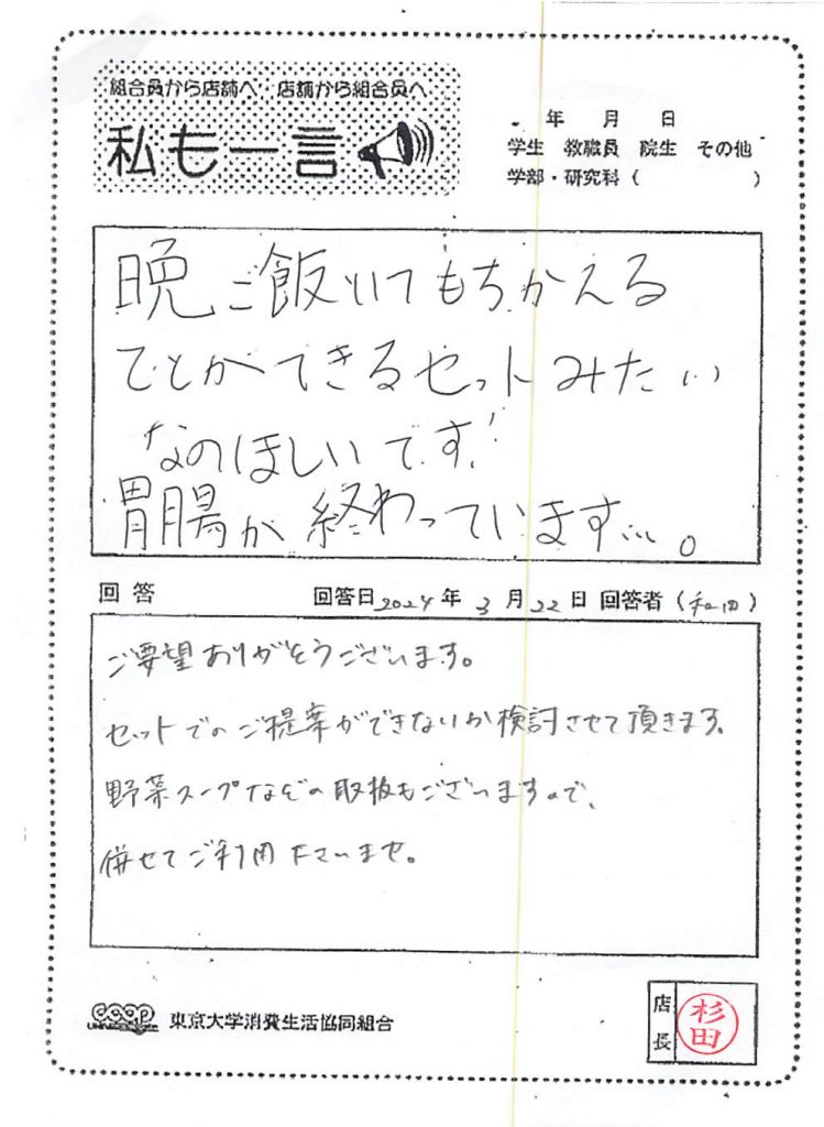 別件になりますが、本郷食堂のドレッシングの置き場がレジを出て左よりに集中し、あたたかいお茶は右よりに集中しているために、両方に用がある場合に2カ所に寄らなくてはならないことが面倒です。また2階で食べる際に動線が混ざります。
