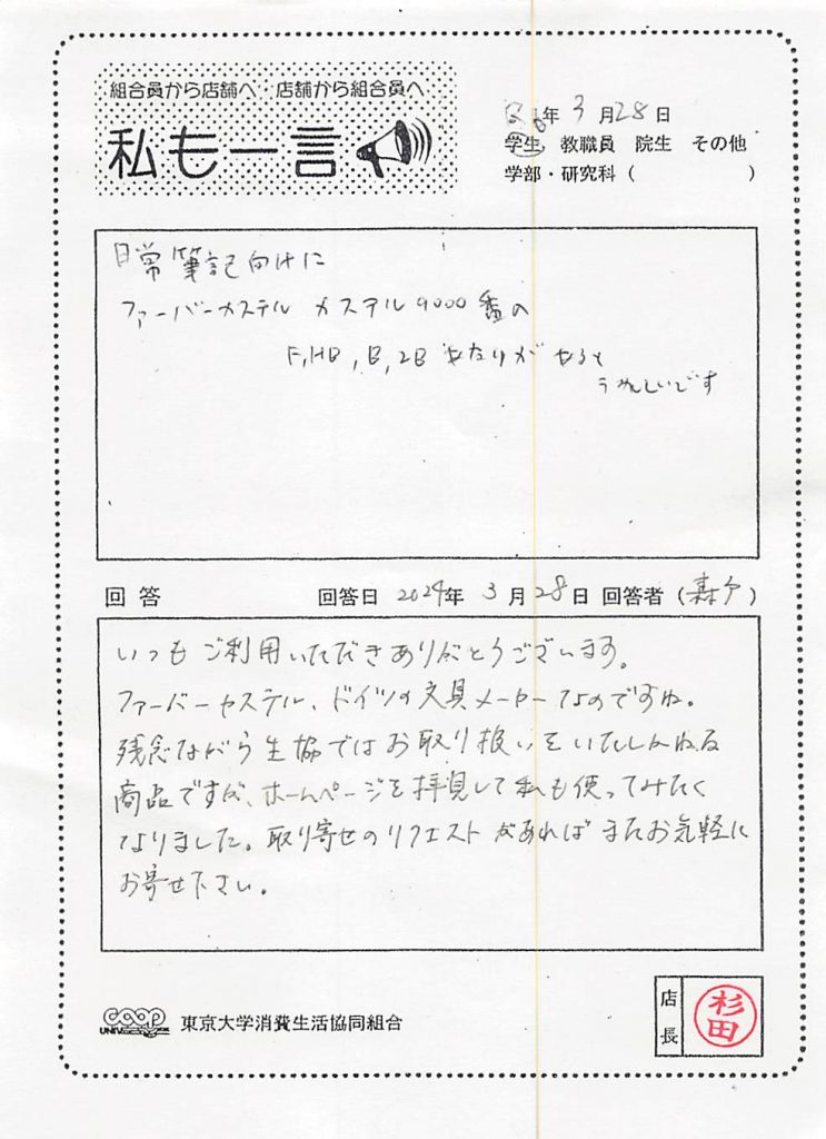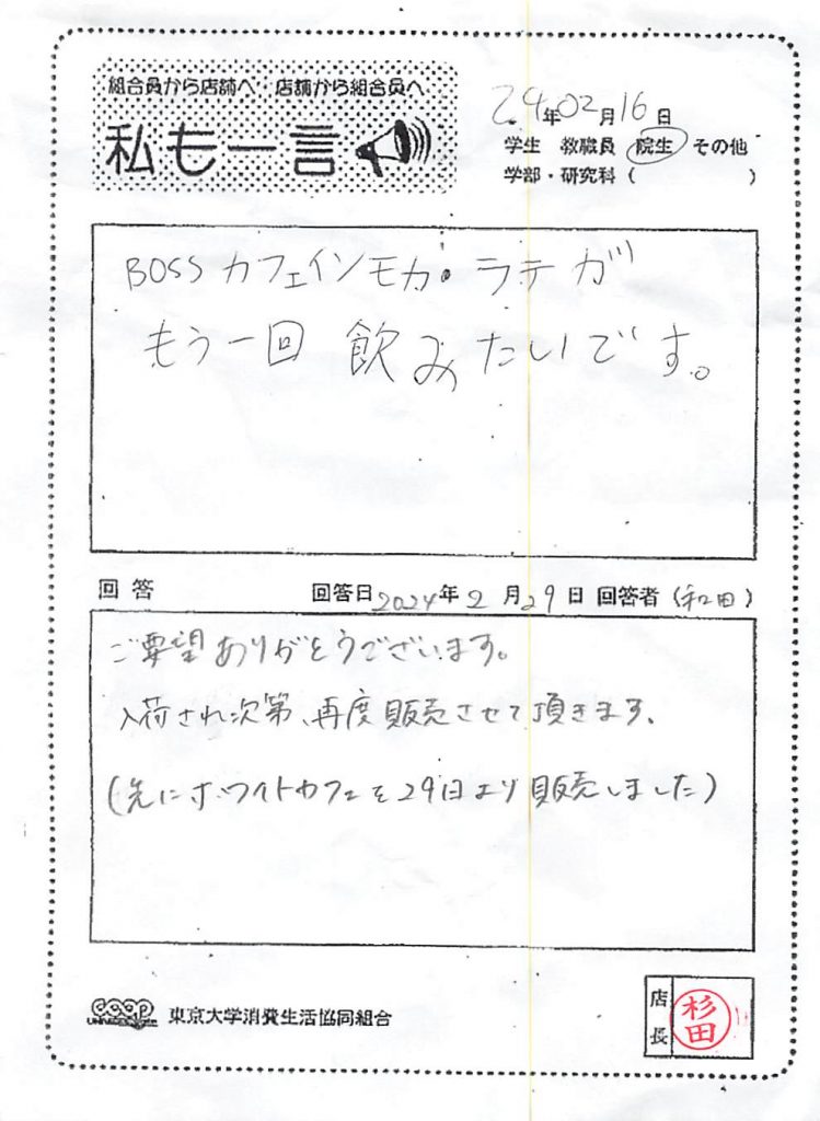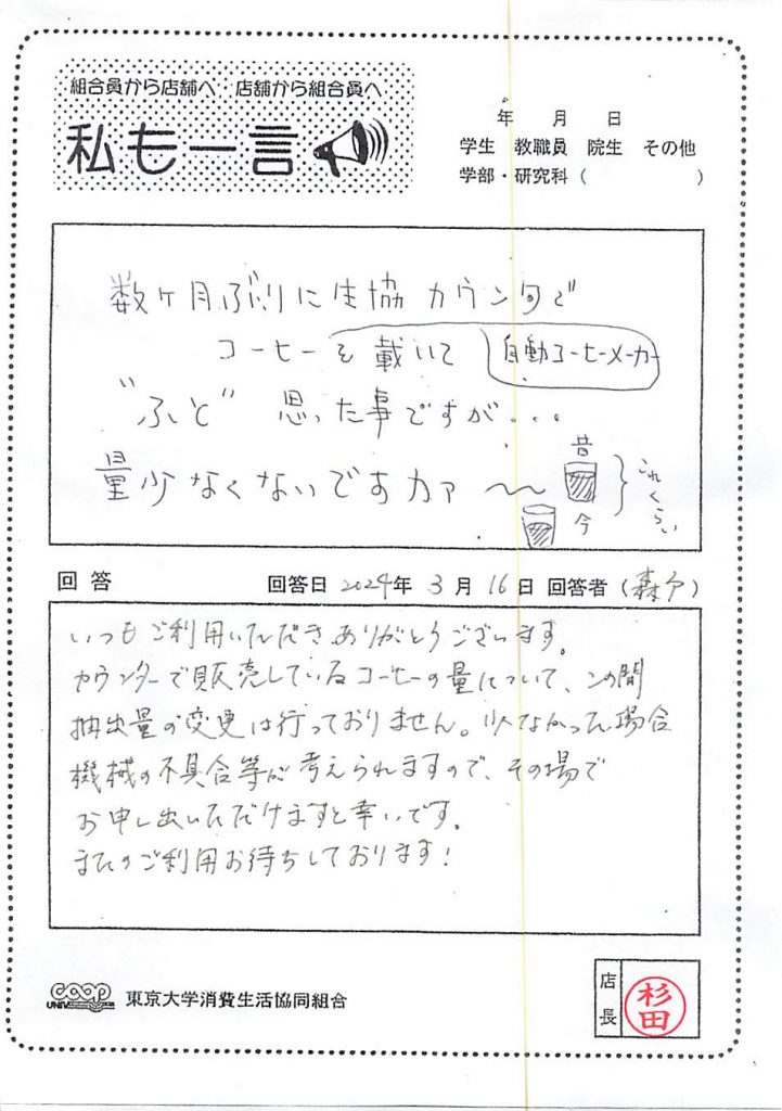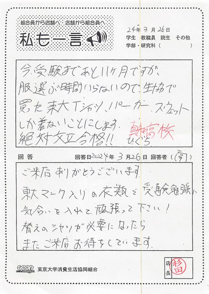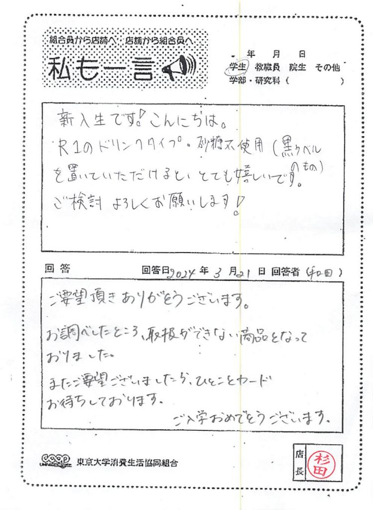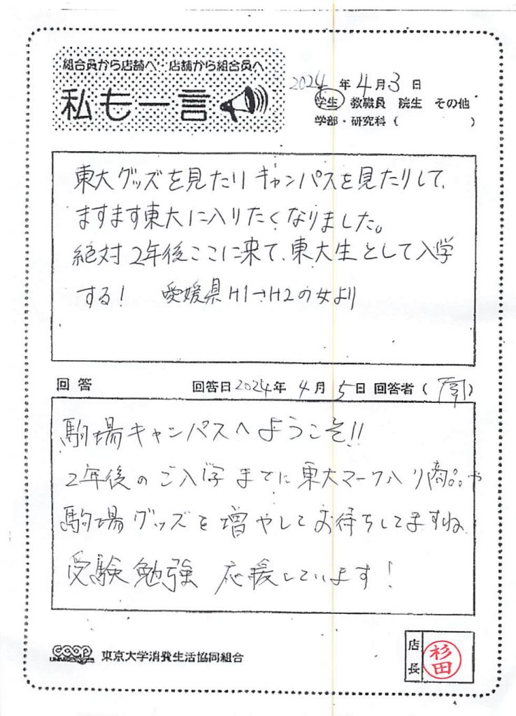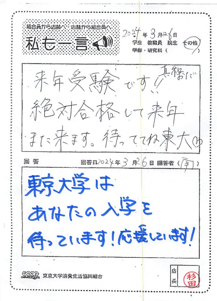 「だからと言って、生協は高くても仕方ない」ということではなく、大学生協では引き続きできるだけ安価に商品をできるよう鋭意取り組んでまいりたいと考えております。期間限定のセールや特定商品の値下げなど取り組みを進めていきたいと考えております。