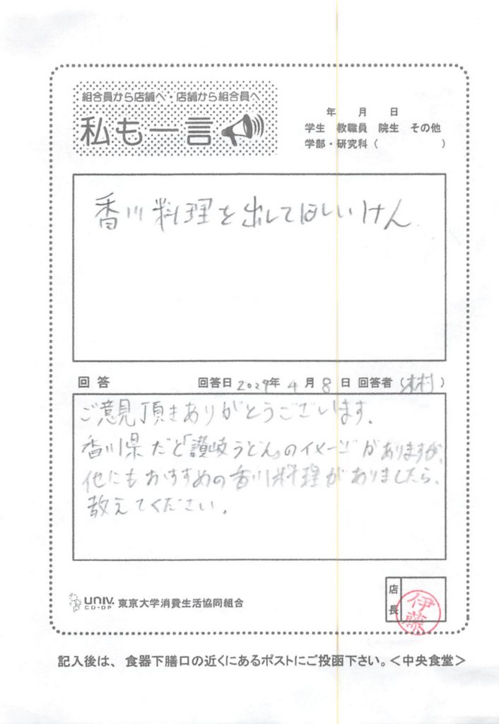 昼利用が多い食堂には安くて量が多く、回転がいいことを求めているが、その反対を行っている。学生のことを考えるつもりがないのか、学食の対抗馬を弱くしたいのか、いずれにせよ生協が取る態度ではない。高級路線の店舗は山上会館の鯛めしやキッチンカーなどで十分補完されている。