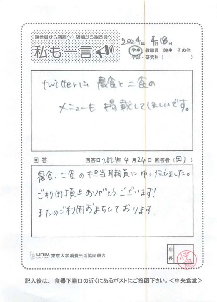 twitterに農食と二食のメニューも・・・