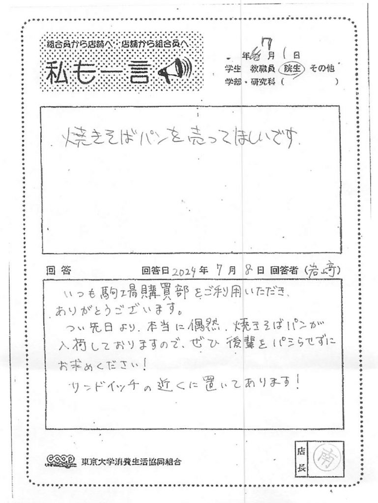 焼きそばパンを売ってほしい・・・