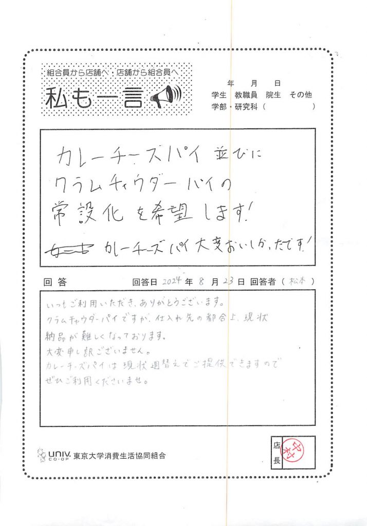 カレーチーズパイ並びにクラムチャウダーパイの常設化を・・・