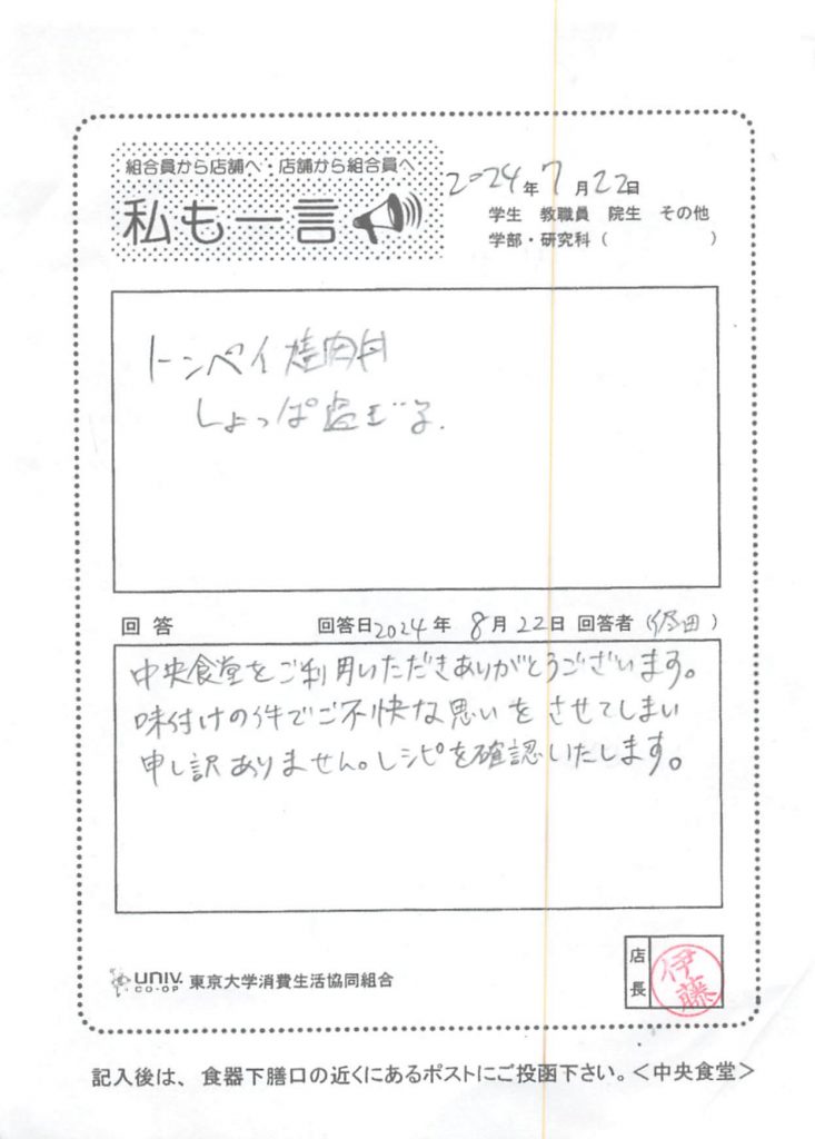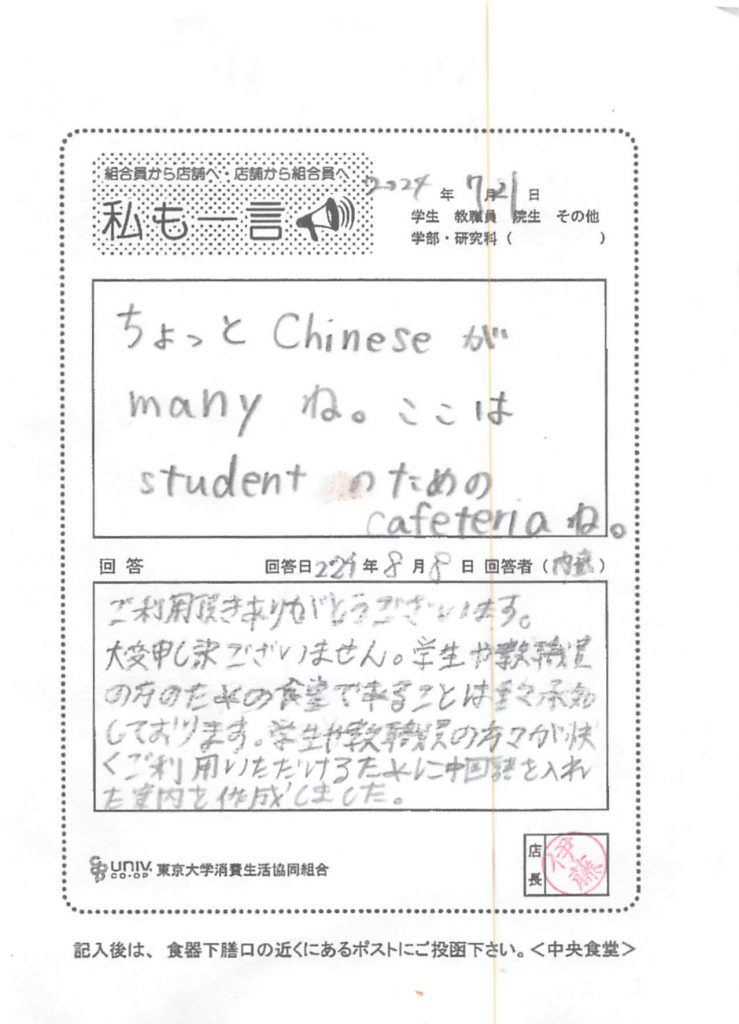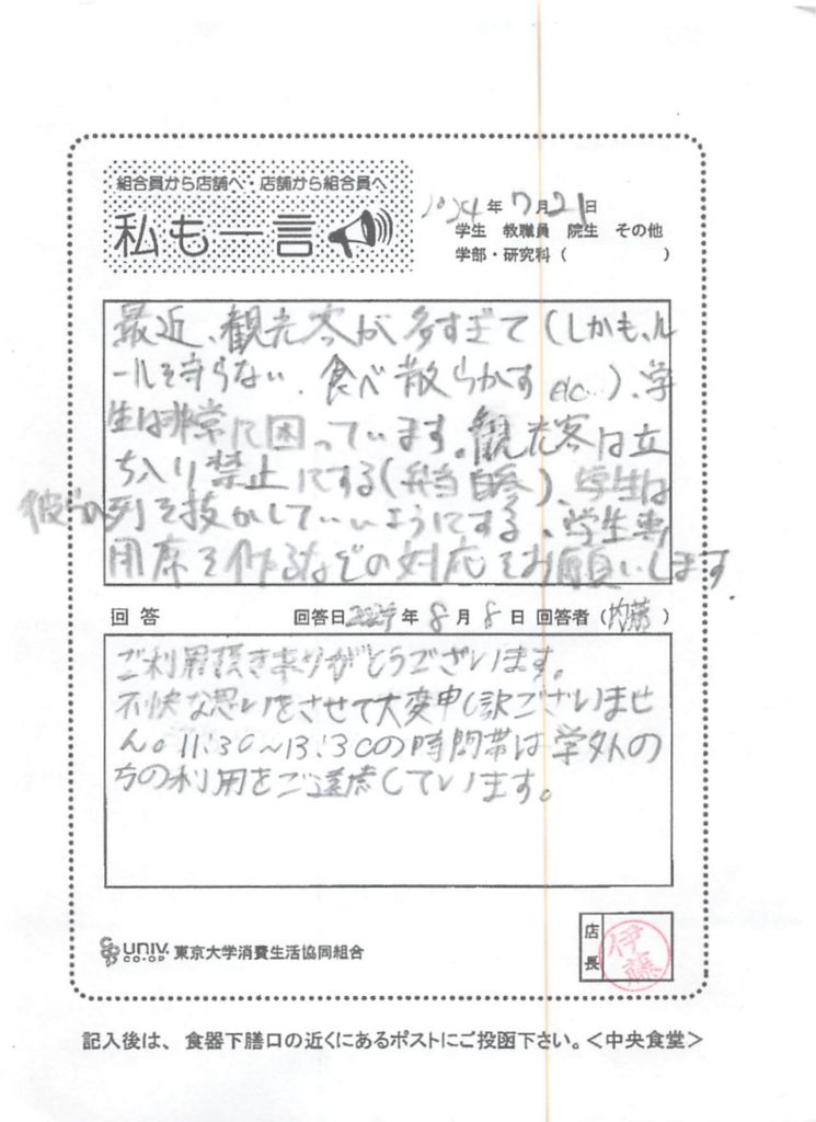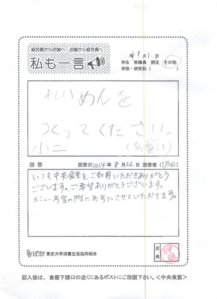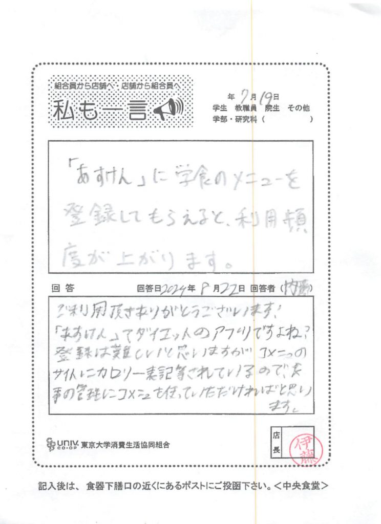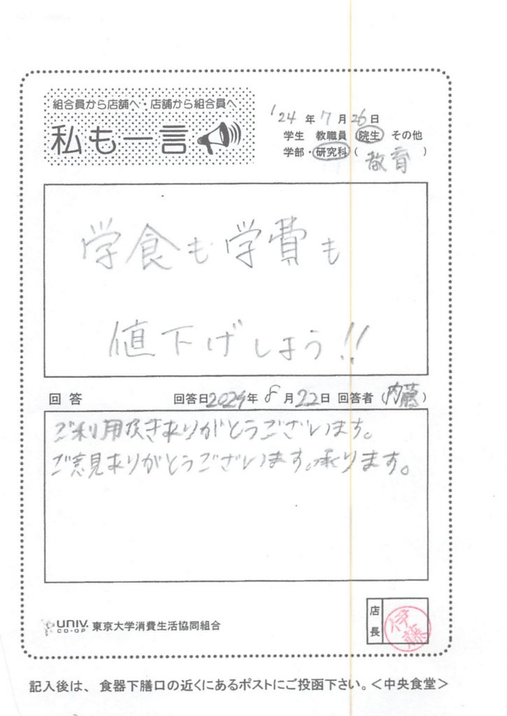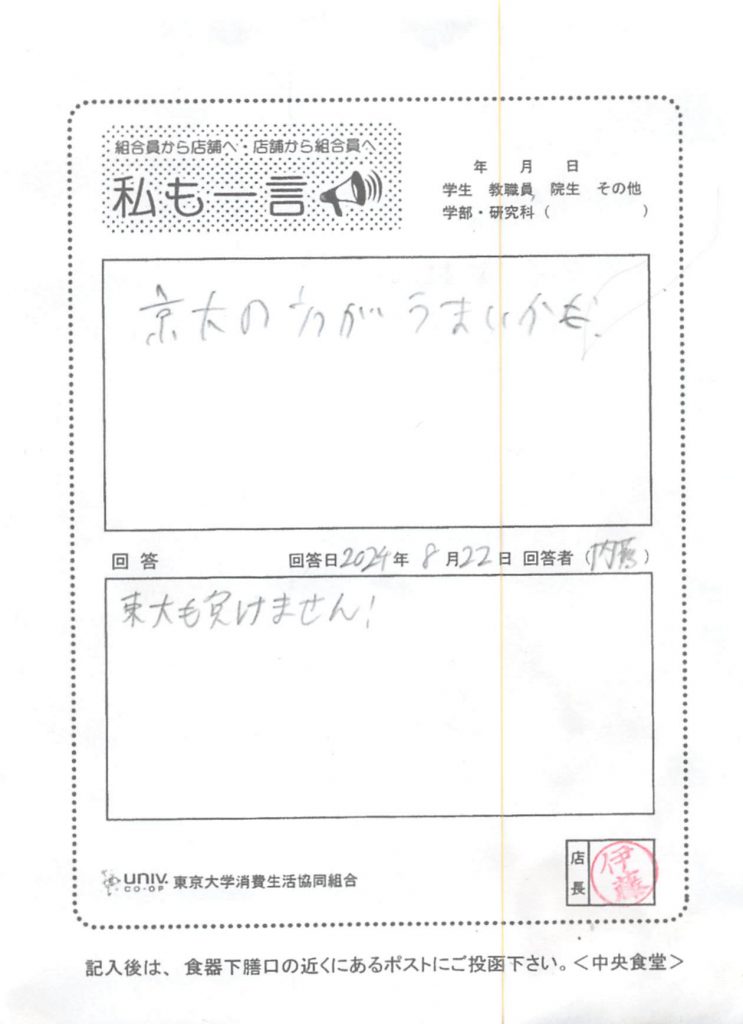 オンライン投稿柏 20248/27 東京大学グッズのお菓子を購入したいのですが・・・ Q: 東京大学グッズのお菓子を購入したいのですが、どちらで購入できますか。 A: 生協で取り扱いの東京大学グッズお菓子の販売は 各キャンパスの購買店舗にて販売を行っております。 Tweet