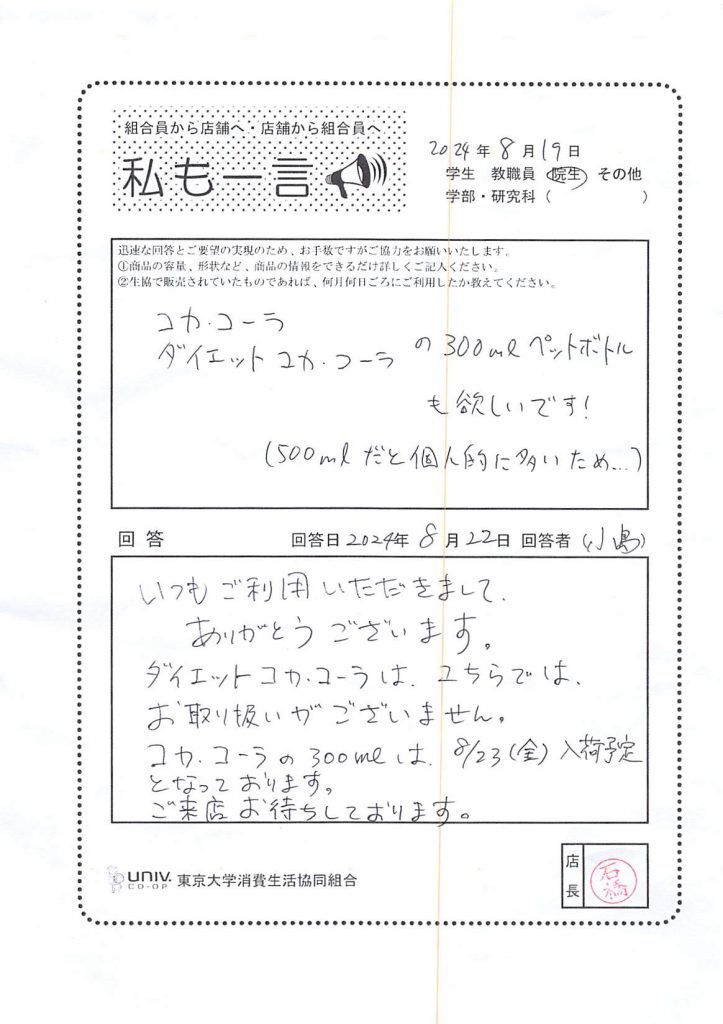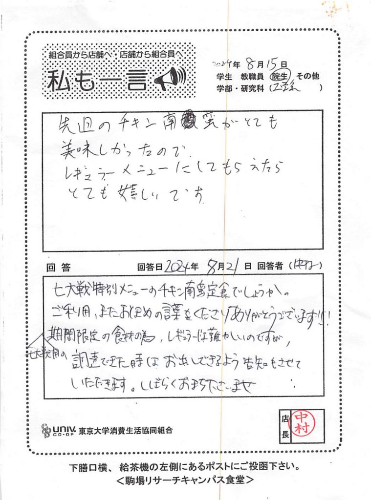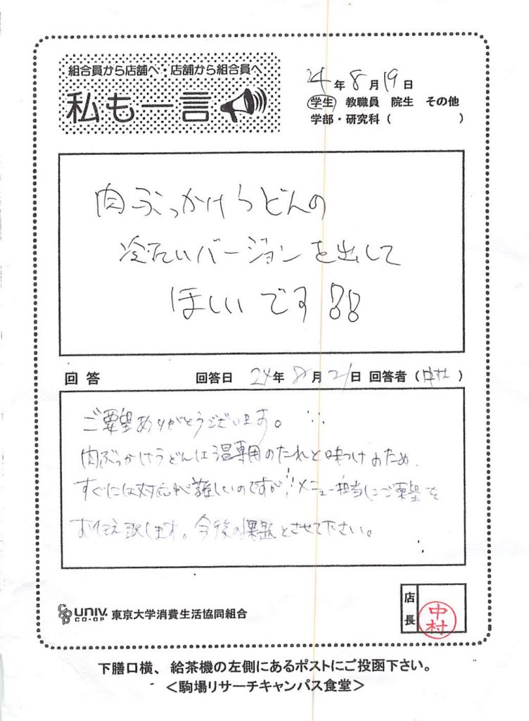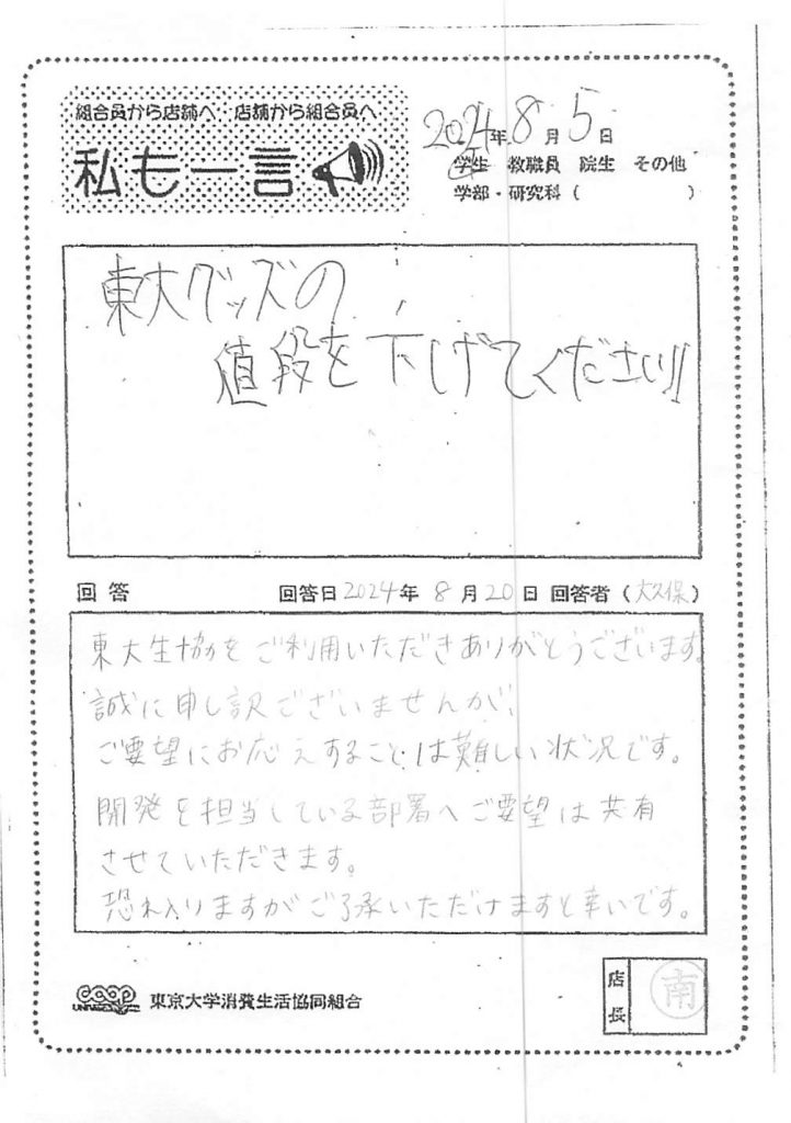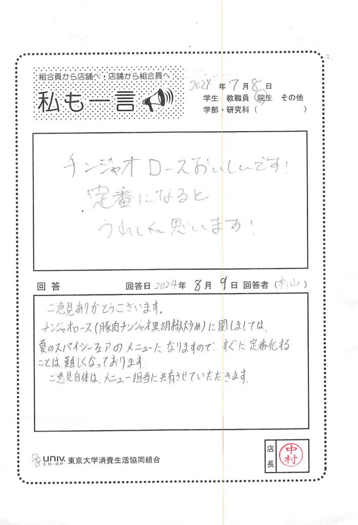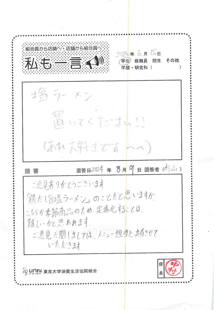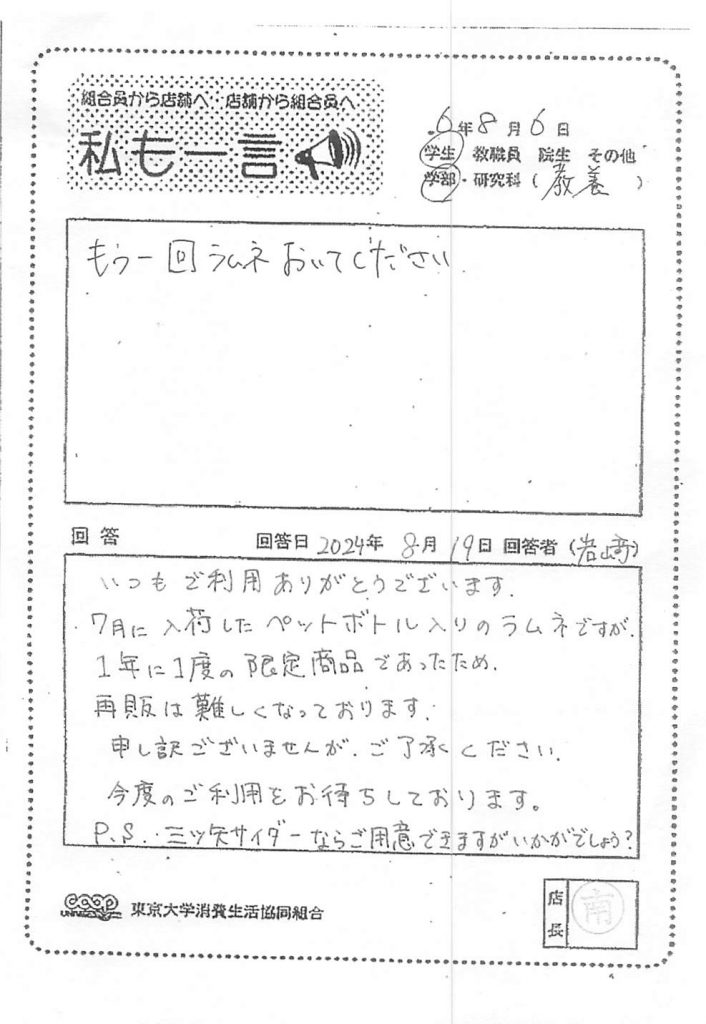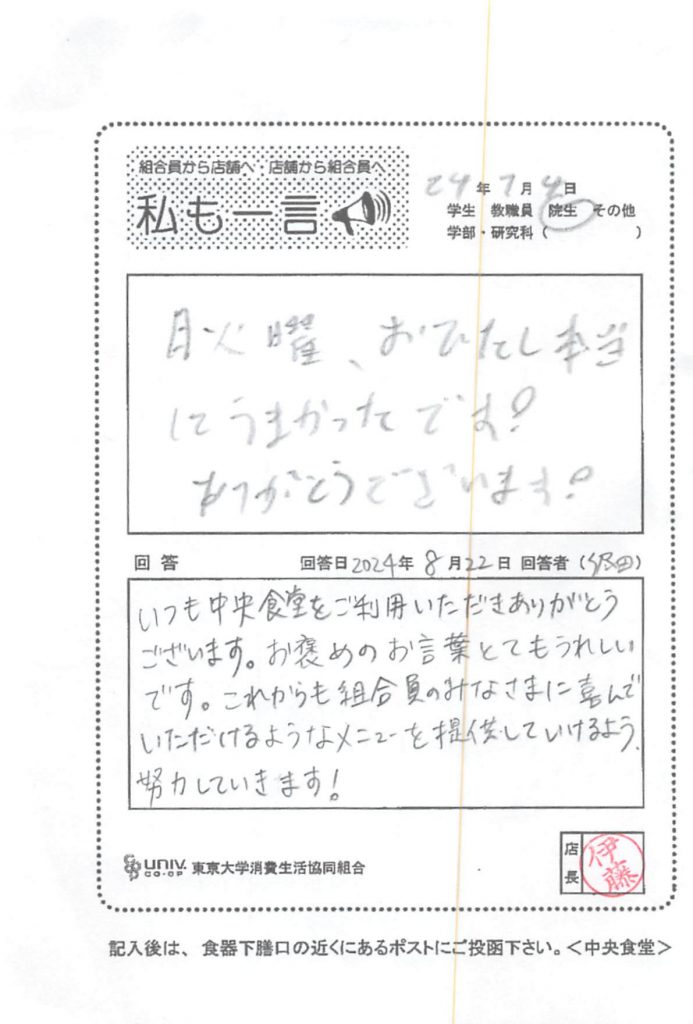 オンライン投稿弥生・浅野 20248/21 上野ハチ公ラーメンは期間限定での発売だったのでしょうか・・・ Q: 本日、農学部の食堂にお伺いしたのですが、ハチ公ラーメンがメニューから消えていました。上野ハチ公ラーメンは期間限定での発売だったのでしょうか。 A: ハチ公ラーメンですが一部の食材が取れなくなり、 今週、来週の金曜日で提供を終了させて頂きます。 申し訳ございません。 Tweet