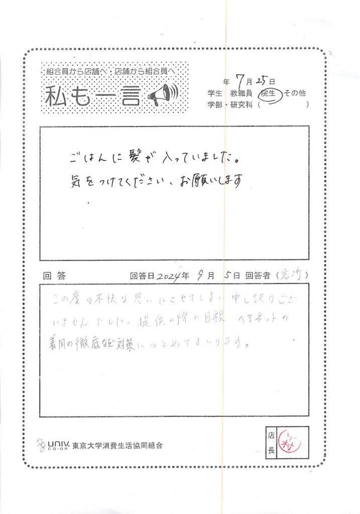 ごはんに髪が入ってました・・・
