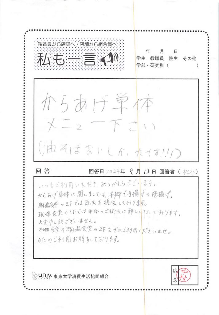 からあげ単体メニュー下さい・・・