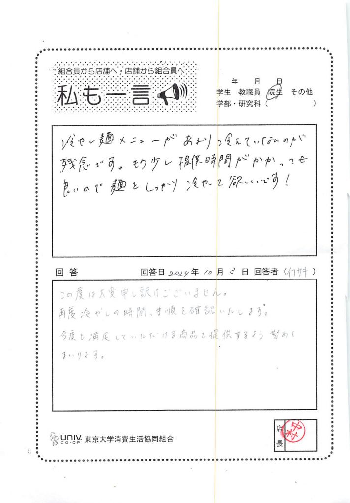 冷し麺のメニューがあまり冷えていないのが残念・・・