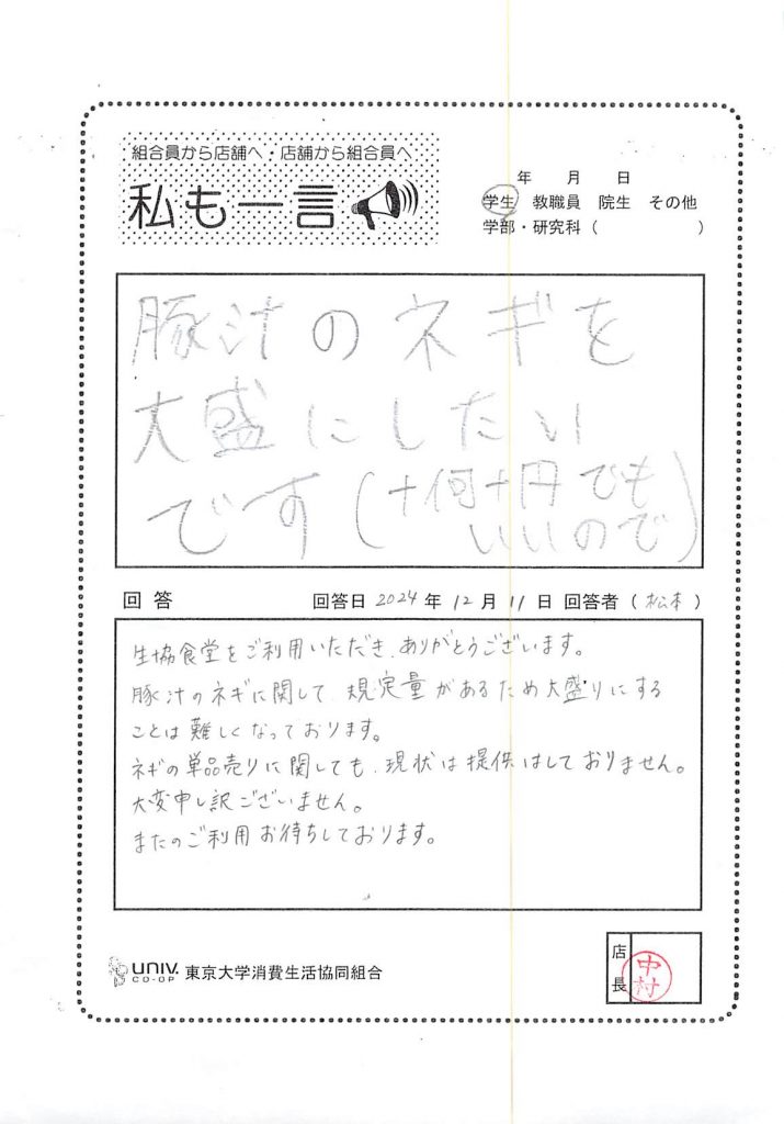 豚汁のネギを大盛にしたい・・・