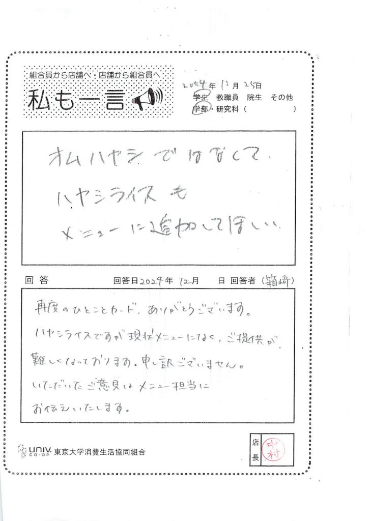 ハヤシライスもメニューに・・・