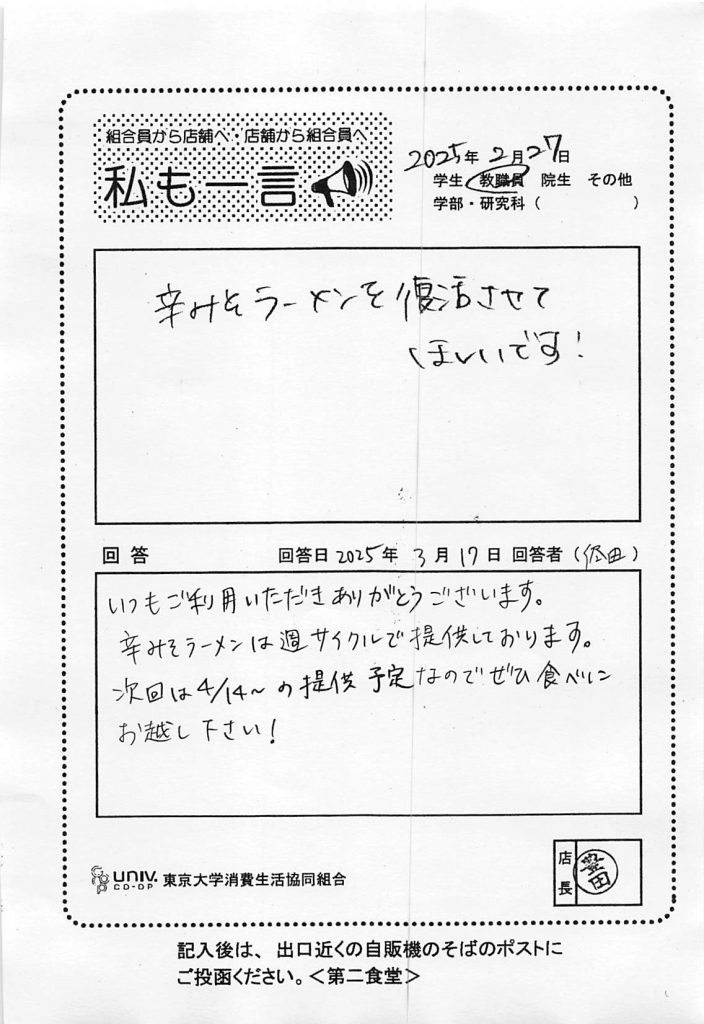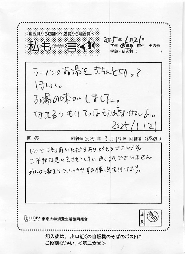 11:30-13:30の学外者利用不可という部分をより徹底し、利用しやすい食堂づくりに努めます。