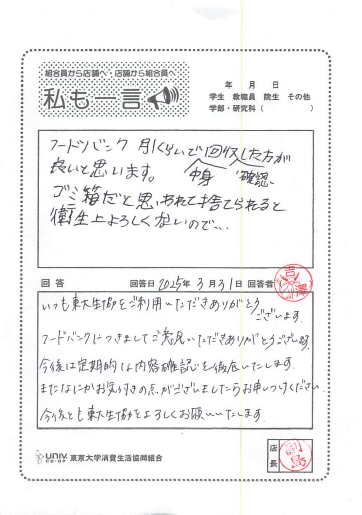フードバンク月1ぐらいで中身回収確認した方が良いと・・・