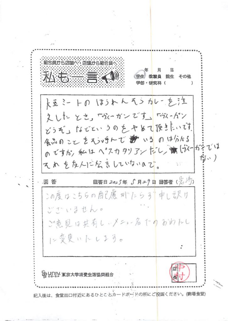 大豆ミートのほうれんそうカレーを注文したとき・・・