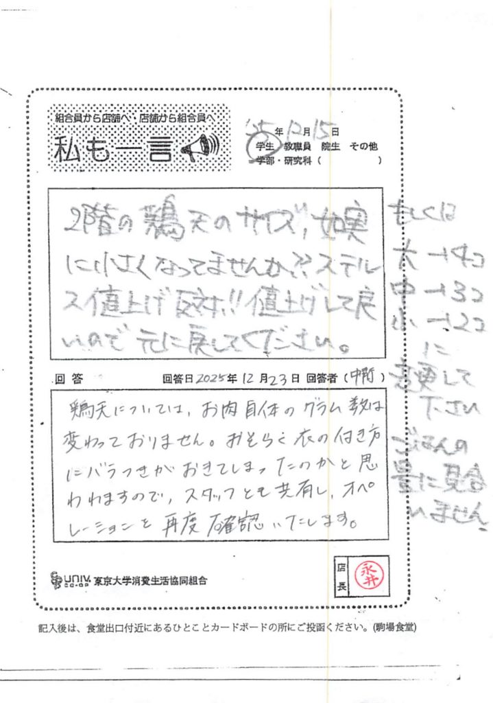 鶏天のグラム数に変更がないとのことですが・・・