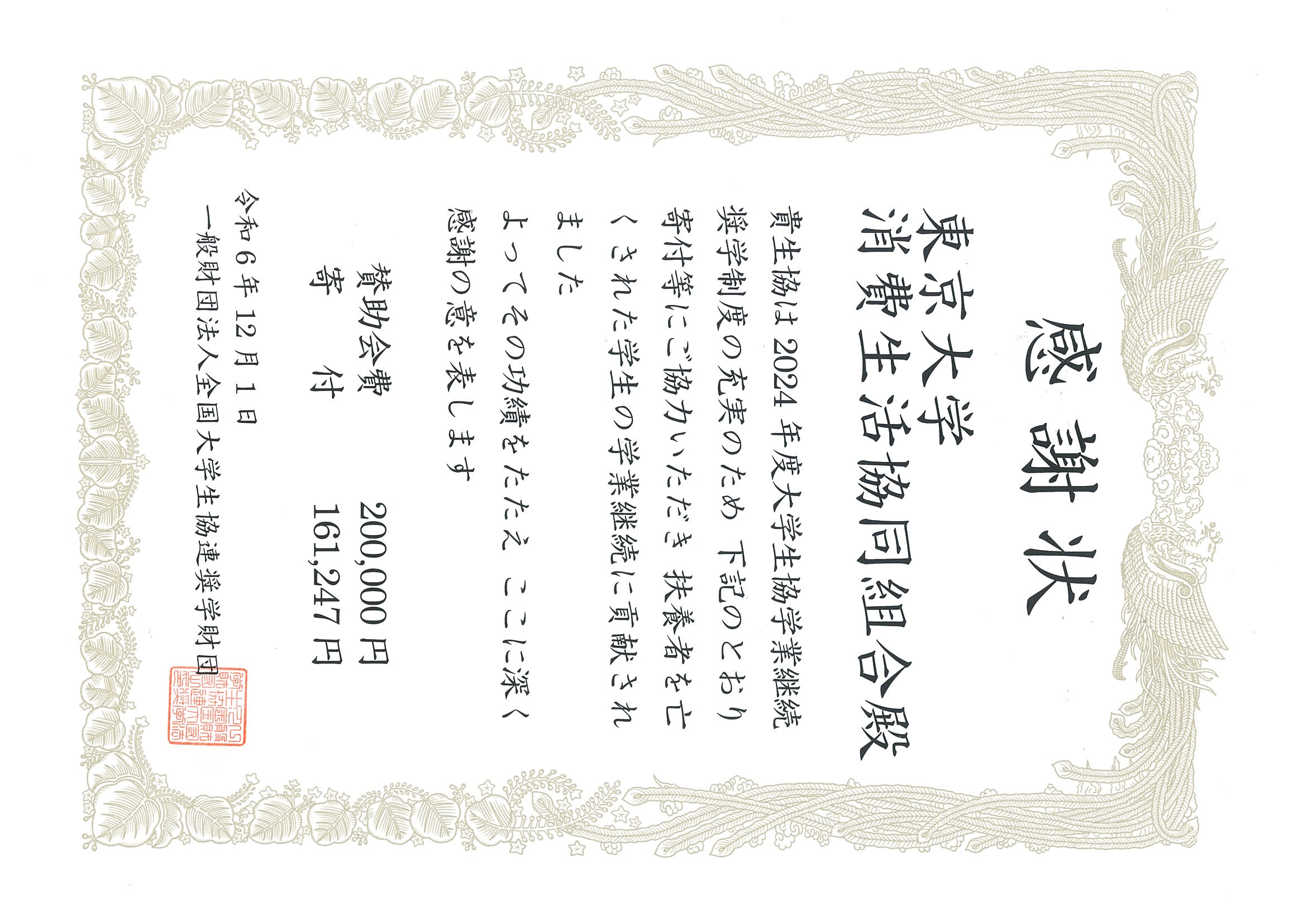 ● 2024年度分(2023年10月から2024年9月) 161,247円(卒業生および店頭募金箱)