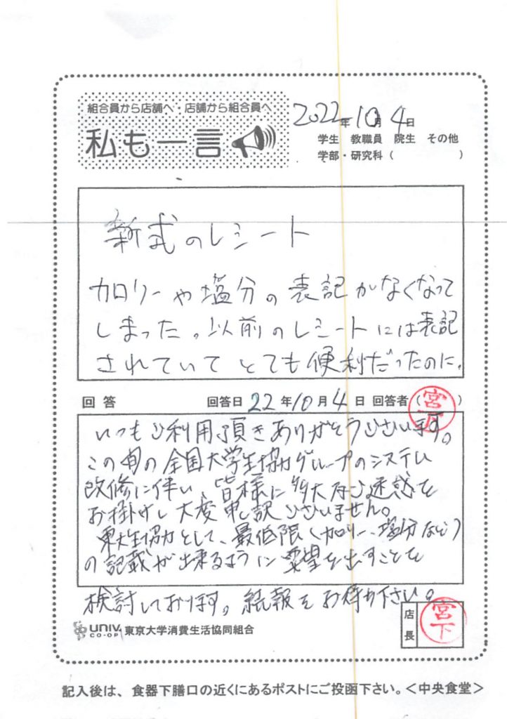 Regarding nutritional value, we apologize for the inconvenience caused to everyone due to the large-scale system change of the National University Co-op Group. The University of Tokyo Co-op has submitted a request for improvement. Please wait a moment now. Thank you for your continued support.