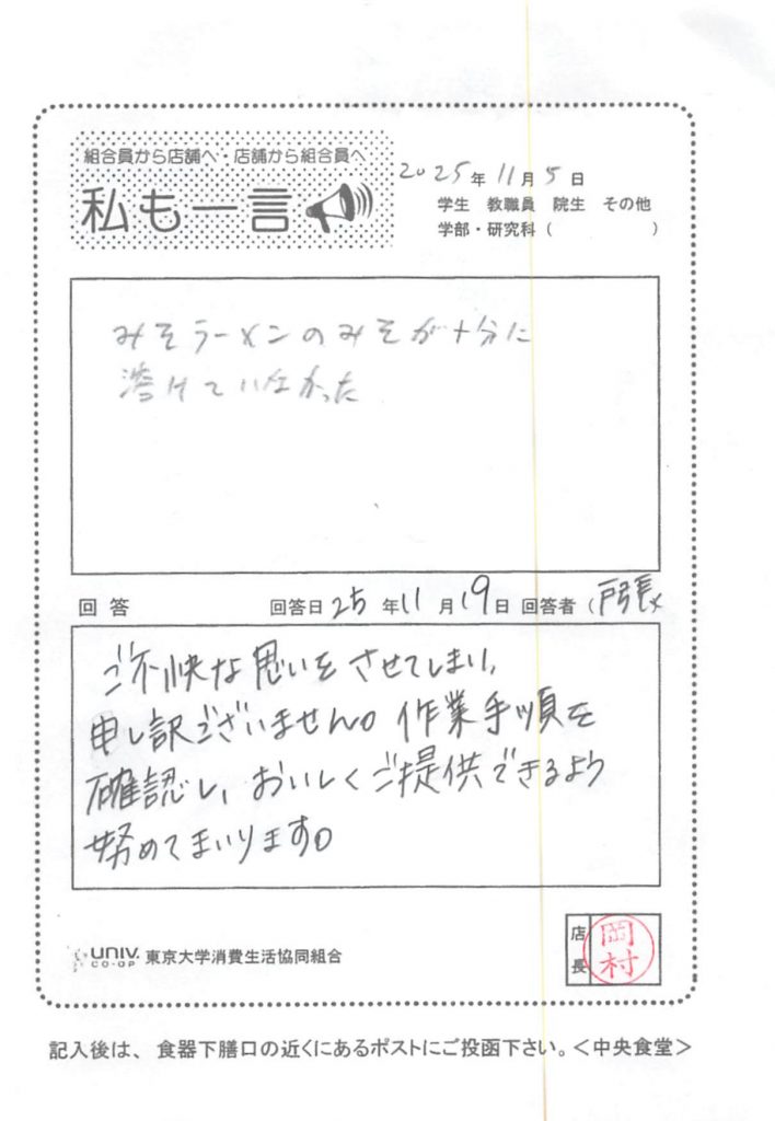 Central cafeteria 202512/24 The miso in the miso ramen wasn't dissolved enough.. Tweet Word Card Collection list