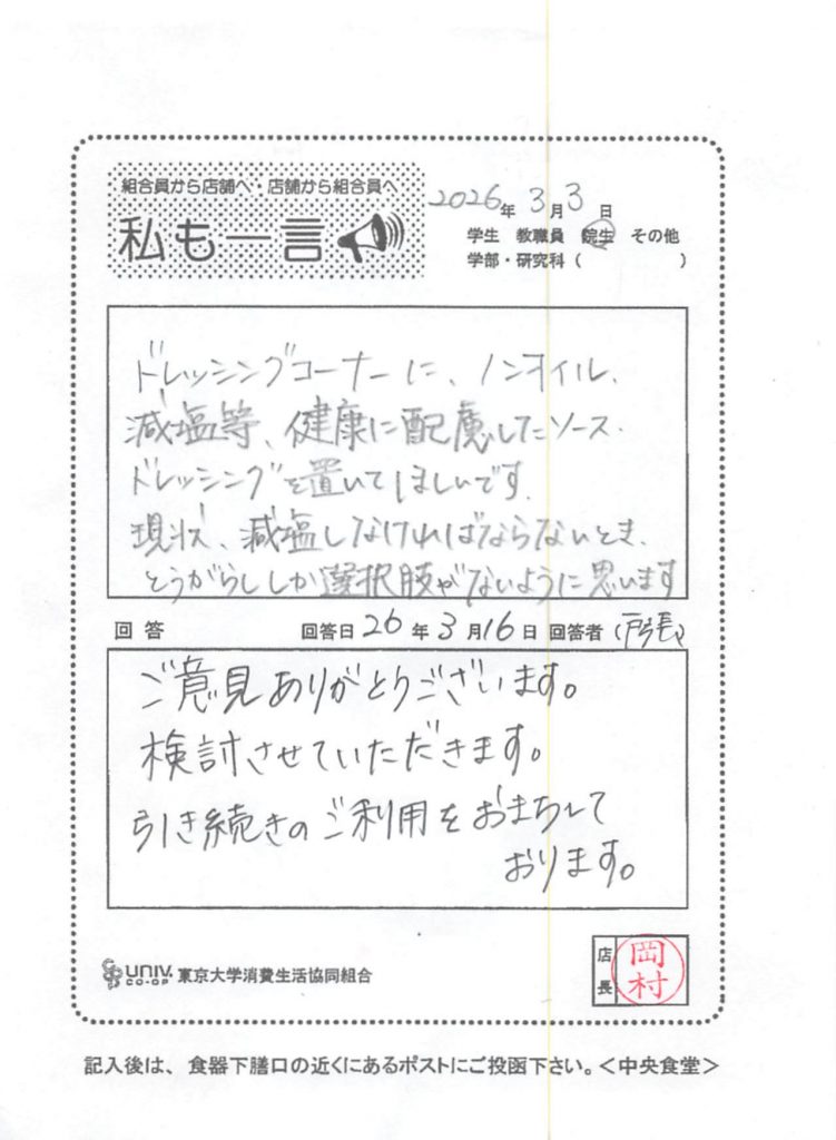 Central Cafeteria 20263/31 Reduced salt content, etc., with health in mind.. Tweet List of message cards
