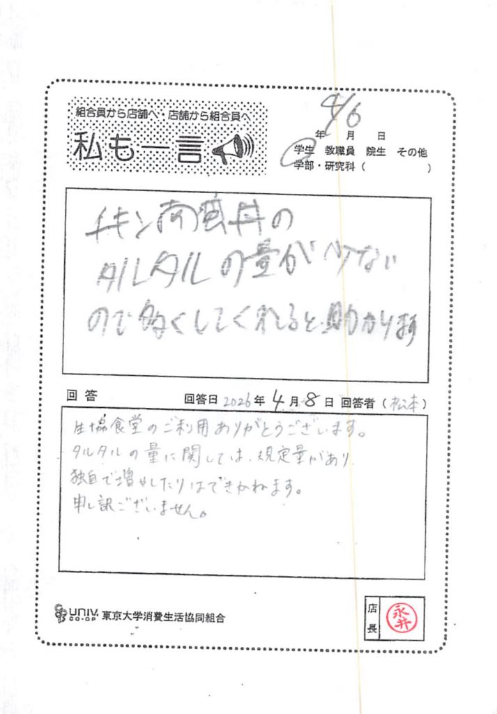 Komaba Restaurant 20264/13 The amount of tartar sauce on the chicken nanban rice bowl is too little.. Tweet List of message cards