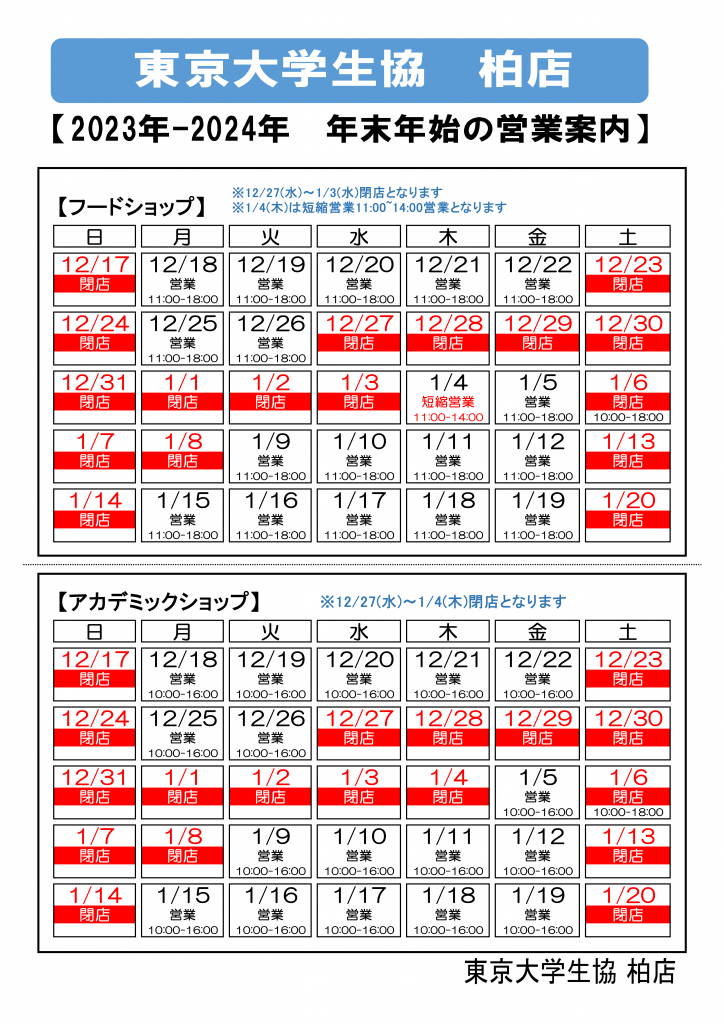 news 202312/19 oak Announcement of Kashiwa store year-end and New Year business schedule 2023–2024 Kashiwa store business scheduledownload Tweet Information List
