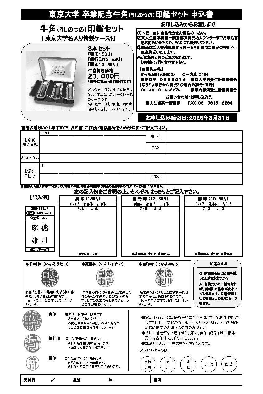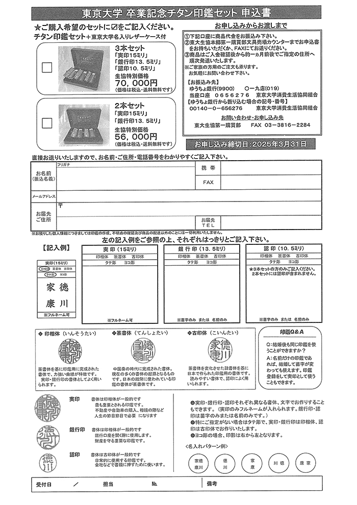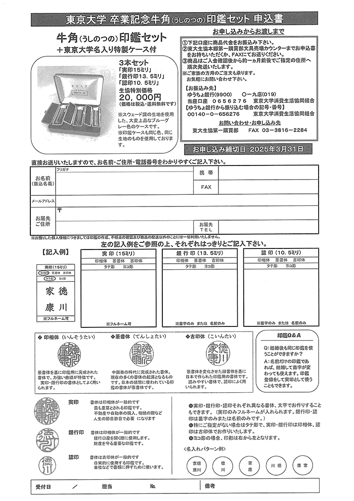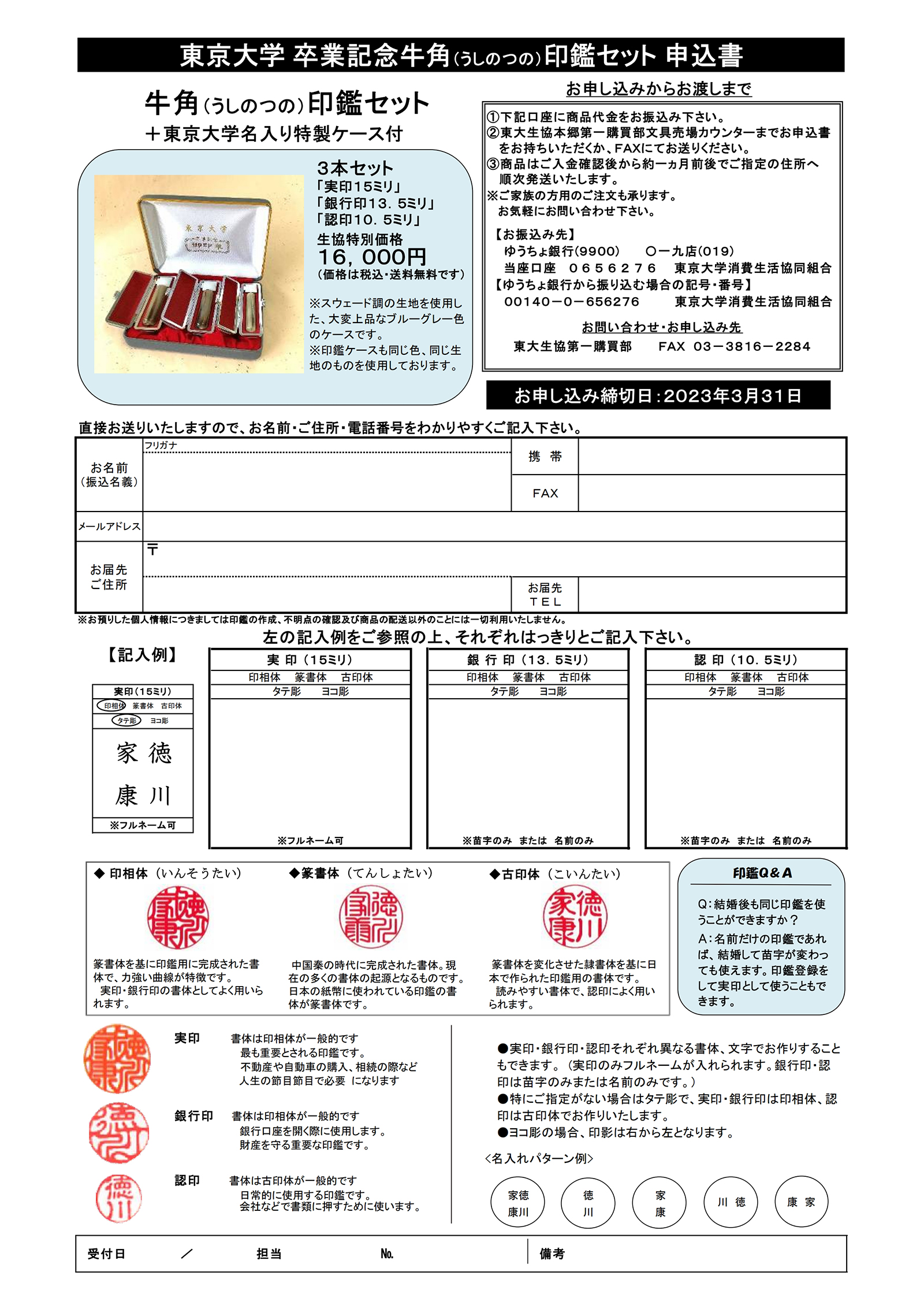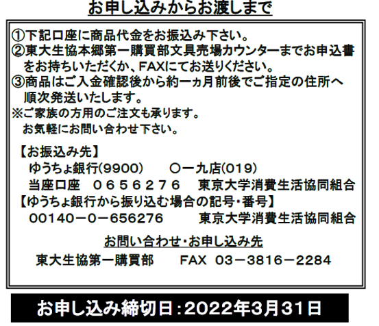 ②東大生協本郷第一購買部文具売場カウンターまでお申込書をお持ちいただくか、FAXにてお送りください。