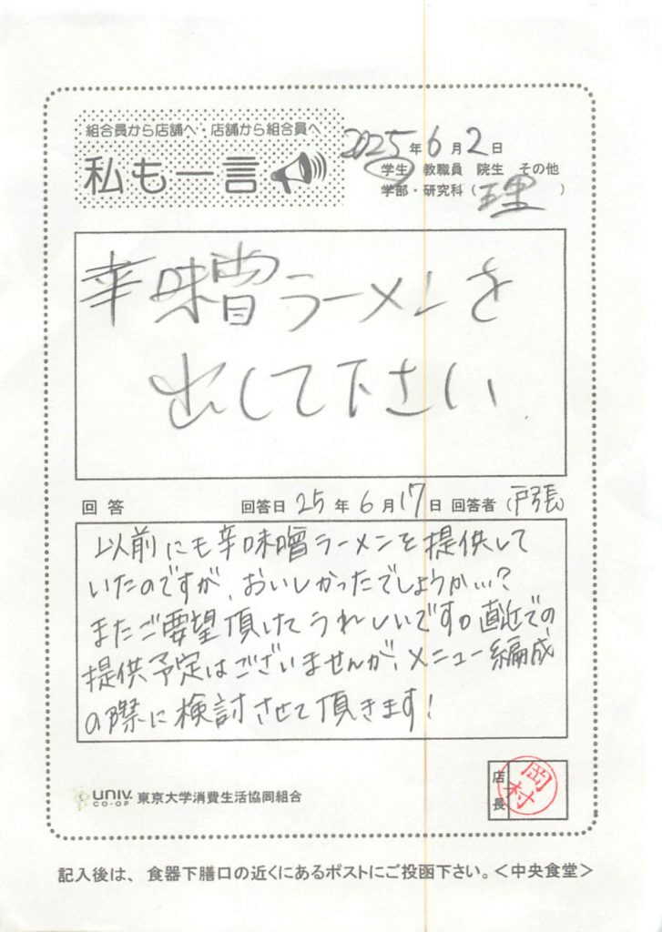 いつも食堂運営にご尽力いただき、ありがとうございます。中央食堂は観光地としての役割もあるかとは思いますが、日常的に利用する学生や教職員の利便性を損ねるような事態は、重く受け止めていただけますと幸いです。よろしくお願いいたします。