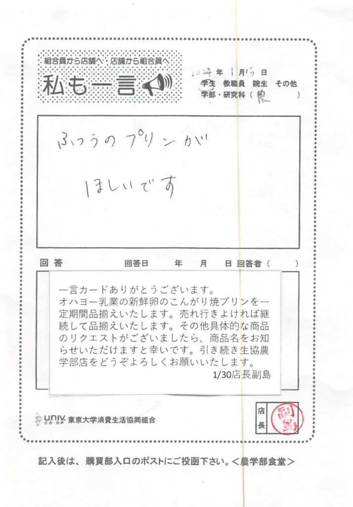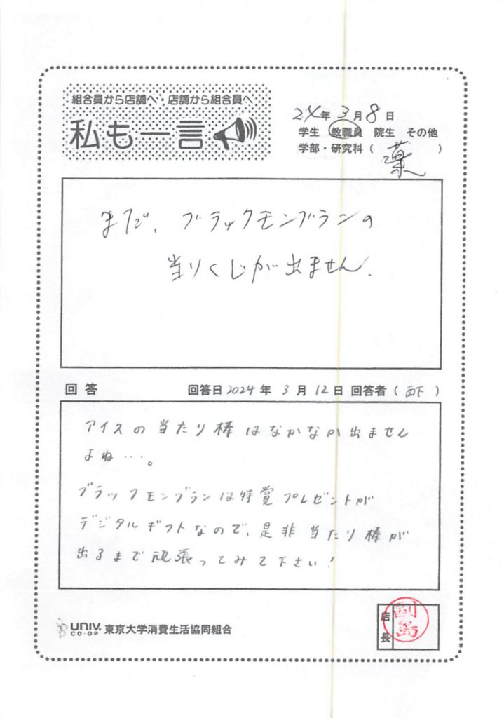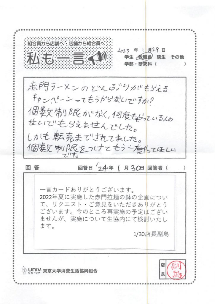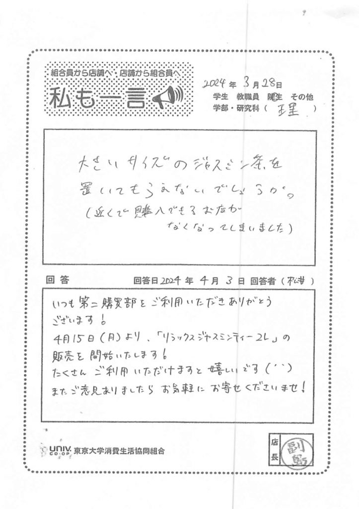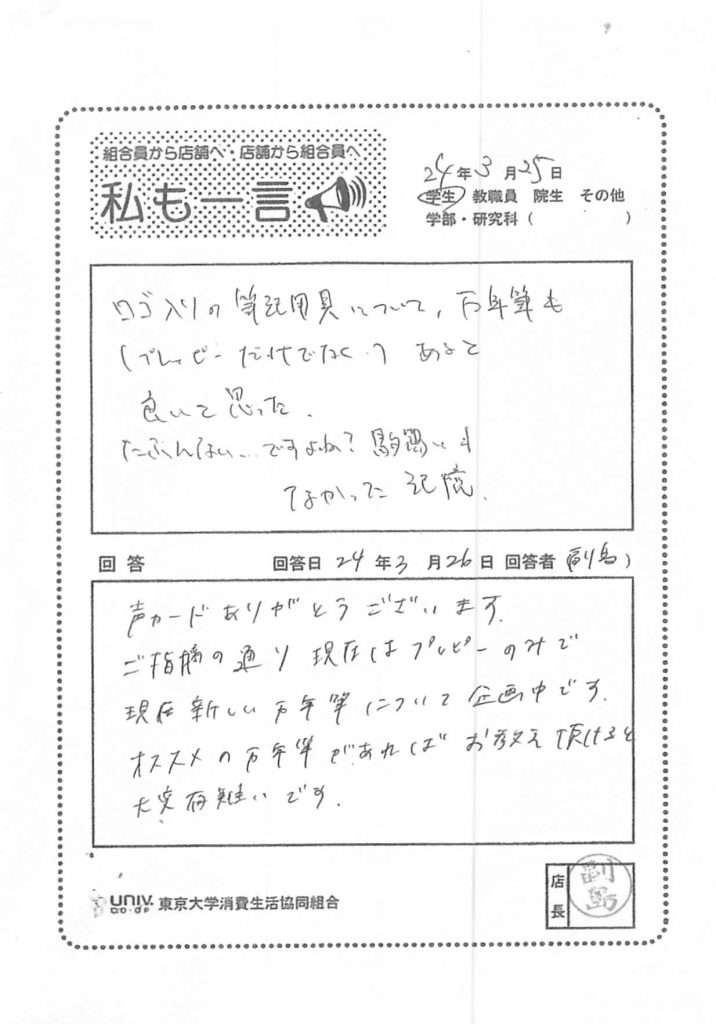 「だからと言って、生協は高くても仕方ない」ということではなく、大学生協では引き続きできるだけ安価に商品をできるよう鋭意取り組んでまいりたいと考えております。期間限定のセールや特定商品の値下げなど取り組みを進めていきたいと考えております。