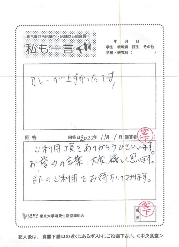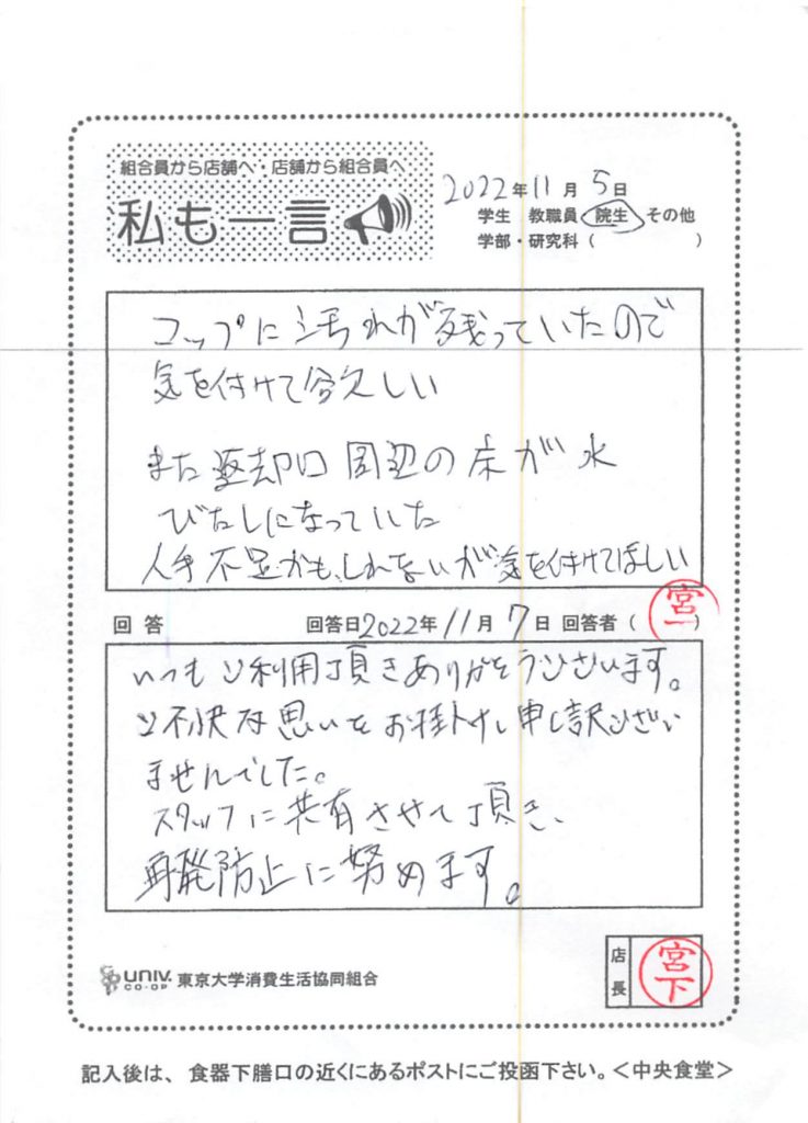 食堂のパーテーションについて、撤廃をお願いしたいです。