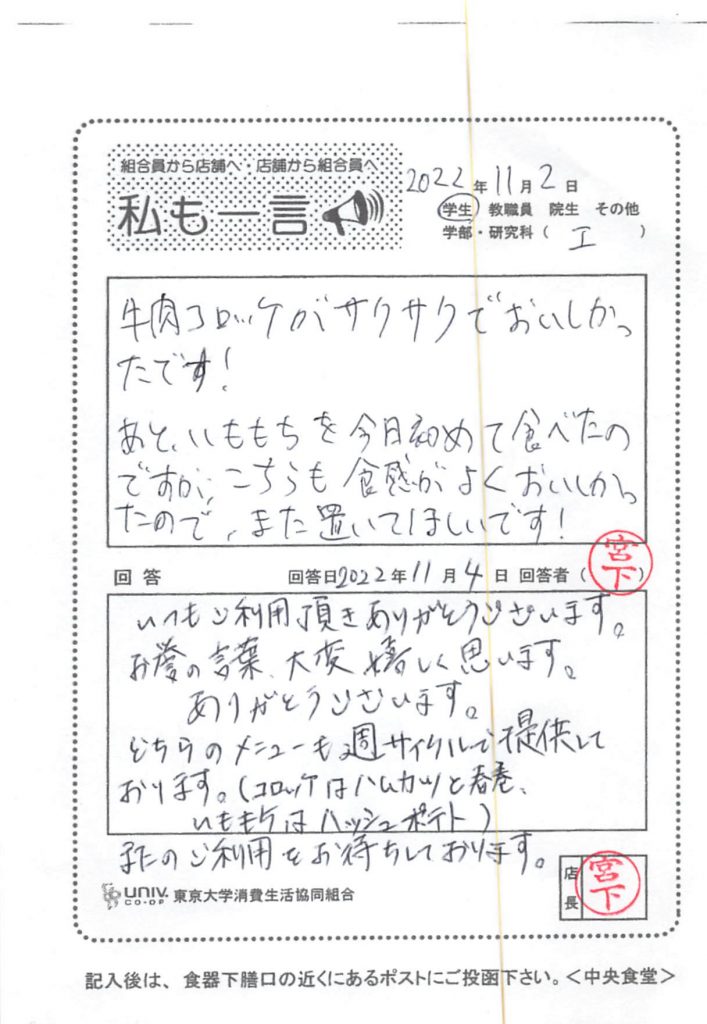 また、隣同士、隣接して食べることが可能な現状では、隣の人との感染リスクが高く、どうせ感染対策を徹底するのならば、全ての席にパーテーションを設置すべきと考えます。