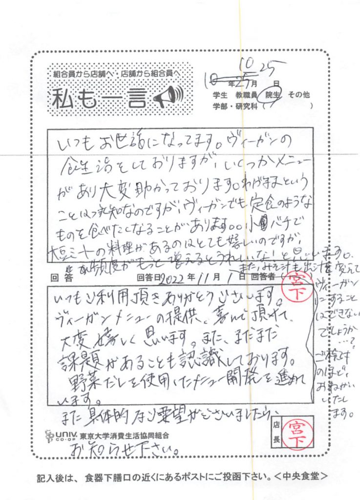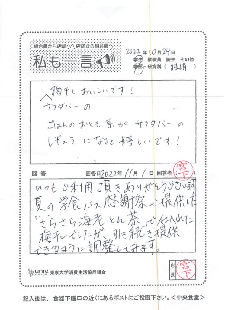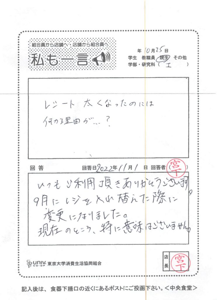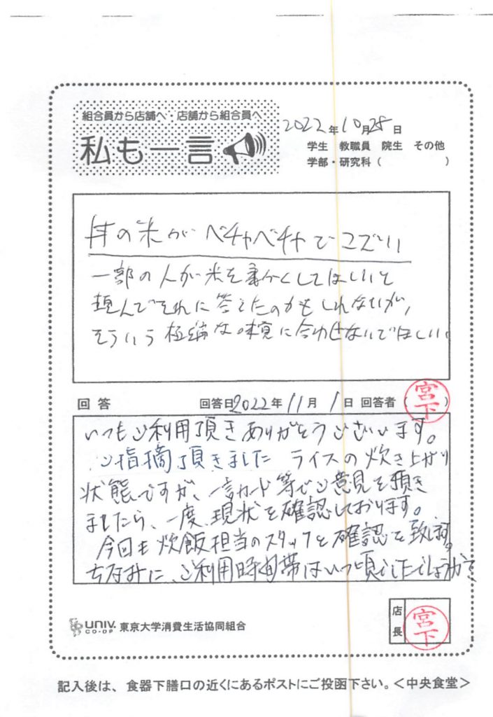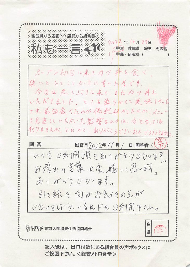 カツ丼を食べ、硬いとひとことカードを書いた・・・