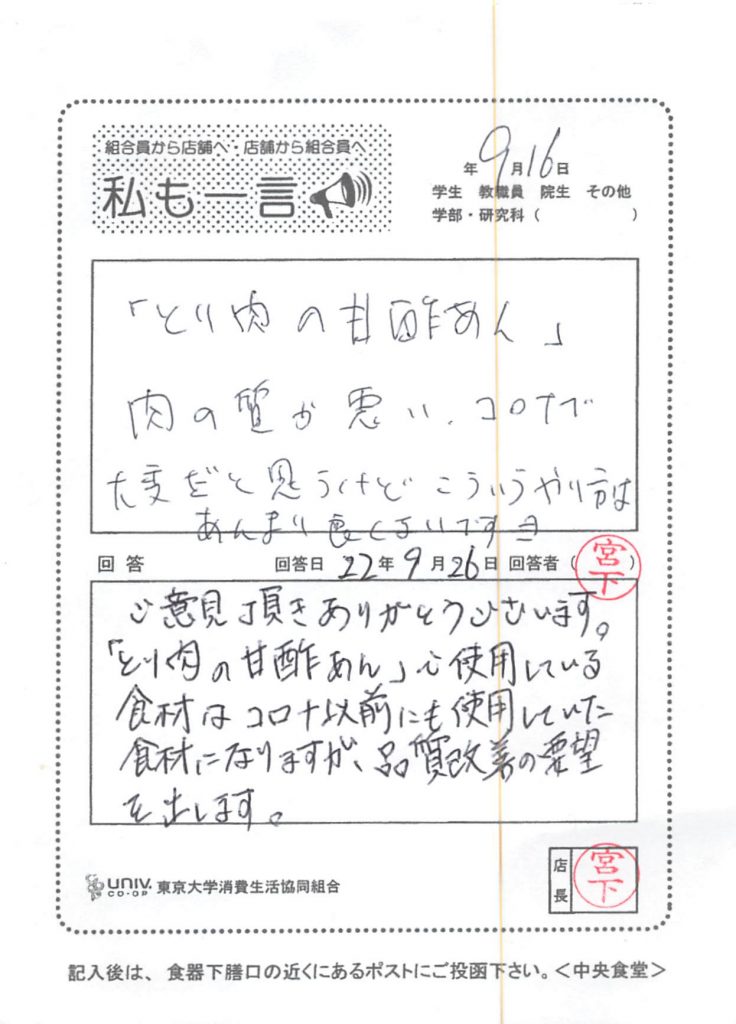 「とり肉の甘酢あん」肉の質が悪い・・・
