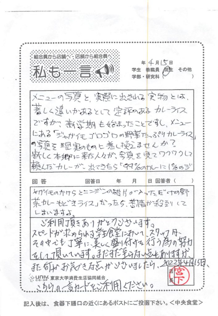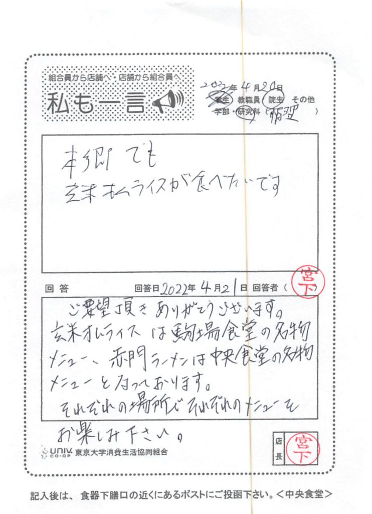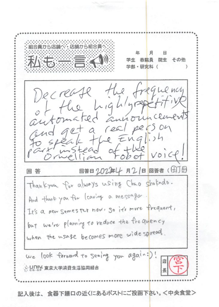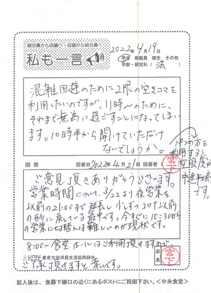 1限後に食事ができるよう、10:30から営業していただきたいです。お昼時の混雑も多少緩和されると思います。