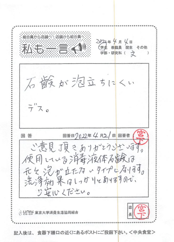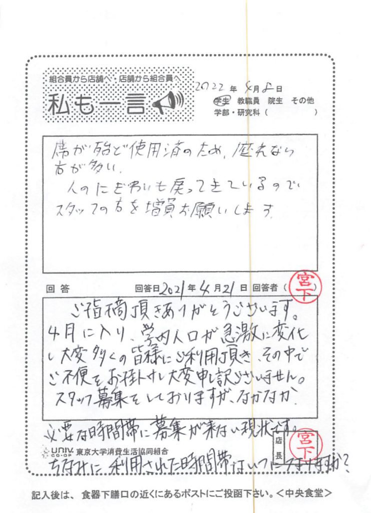 新学期となり昨年に比べ大変多くの皆様にご利用頂いております。その中で12:00~12:30の時間帯は大変混雑しており、感染防止対策で席の間引き(現在270席程度)を行いながら、コロナ前の19年度同時間帯とほぼ同程度の利用(500~550名)となっております。よってこの時間帯は、中央食堂内の商品ご利用者の方のみの時間とさせて頂きます。