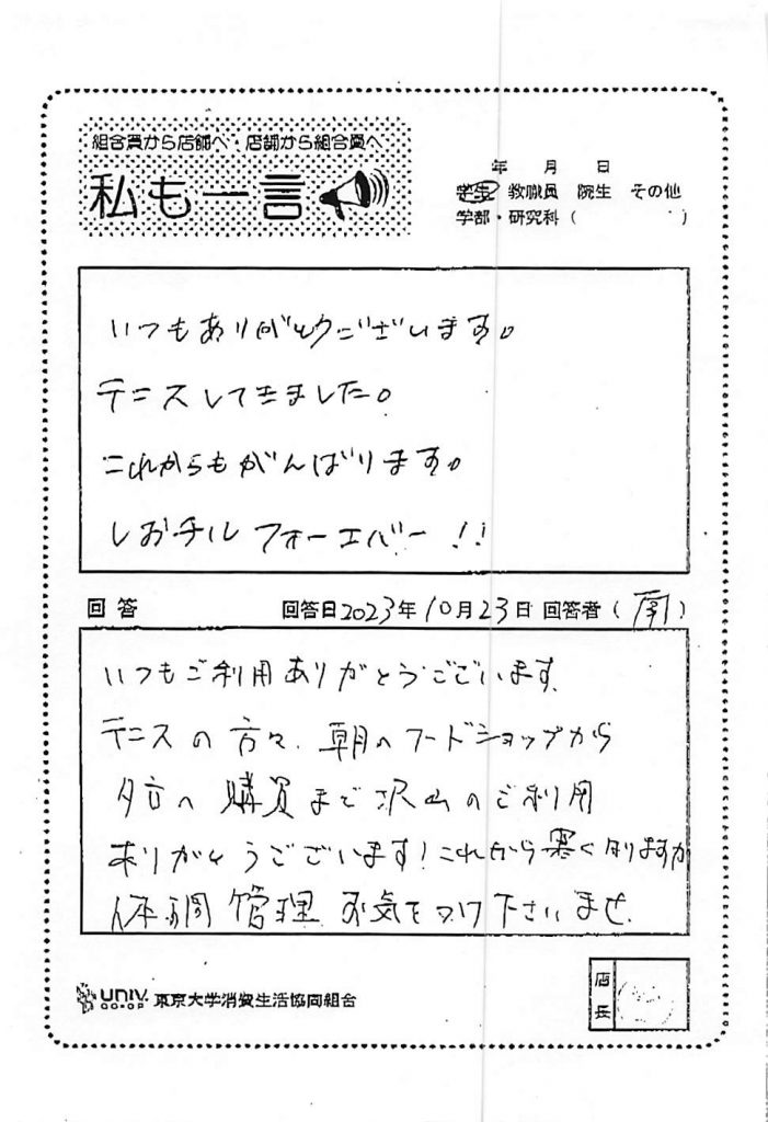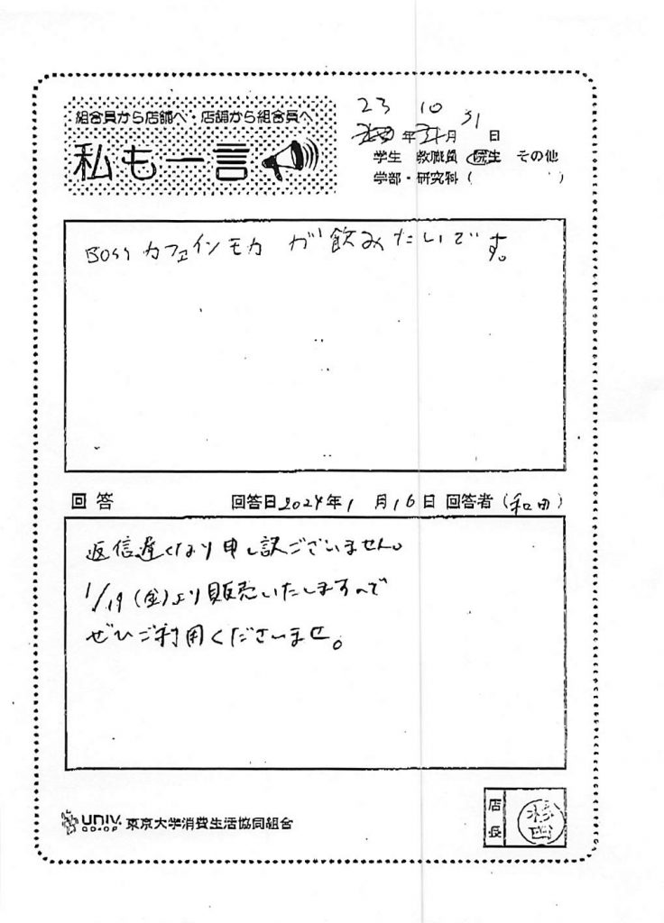 駒場購買部で販売している「ウッフ パウンドケーキ」がおいしかったので感想を送ります。長く置いてもらえると幸いです。パッケージがすごくシンプルなので、買うのにちょっと勇気がいるかもしれません。このパウンドケーキはふわふわ系ではなくしっとり系ですが、しっとりだけではないくちどけの良さがポイントです。口に入れると、まず卵と砂糖の甘い香りがします。噛むと生地がほろりとくずれて、卵のコクとやさしい甘みが広がります。生地が口の中に残る感じが少なく、すっと溶けていき後味もよいです。こういったケーキは食べた後に口中がべたつくのが残念なことがありますが、この商品は卵の配合が多いためか後味がよいのだと思います、