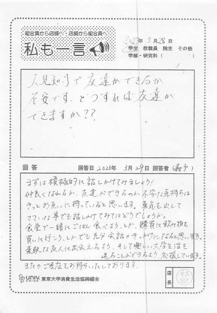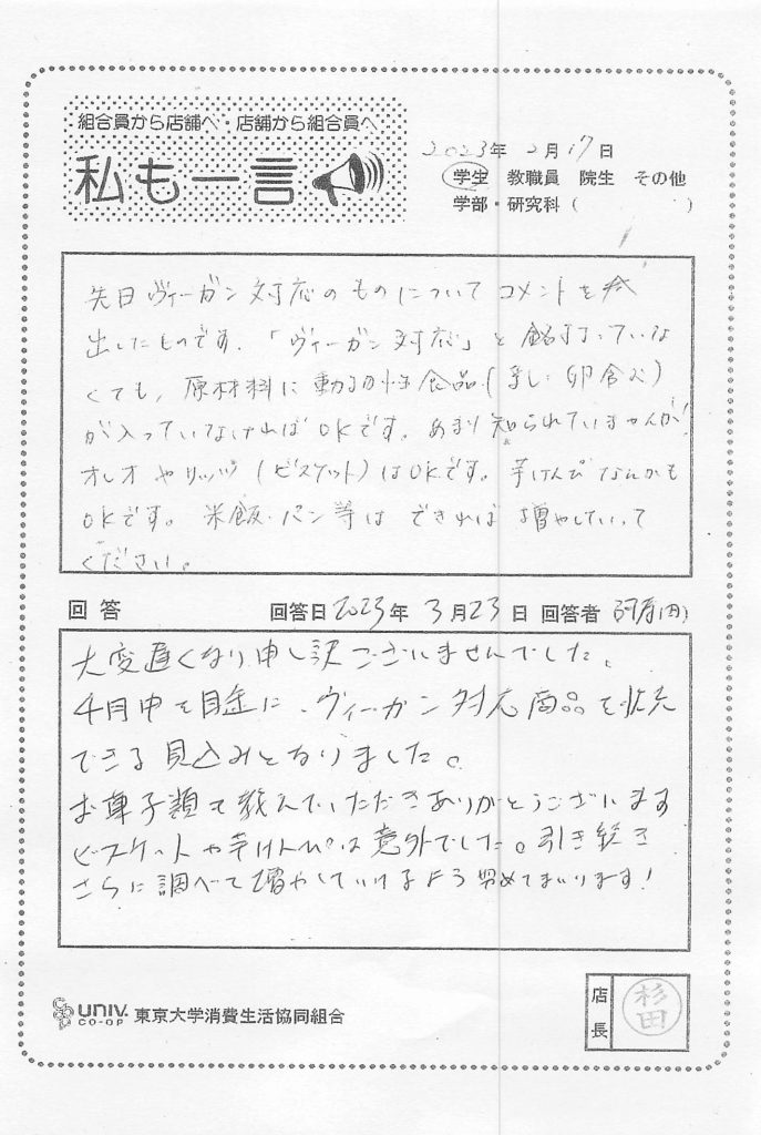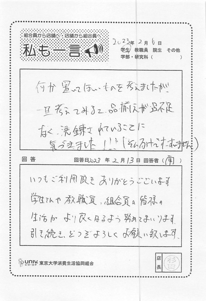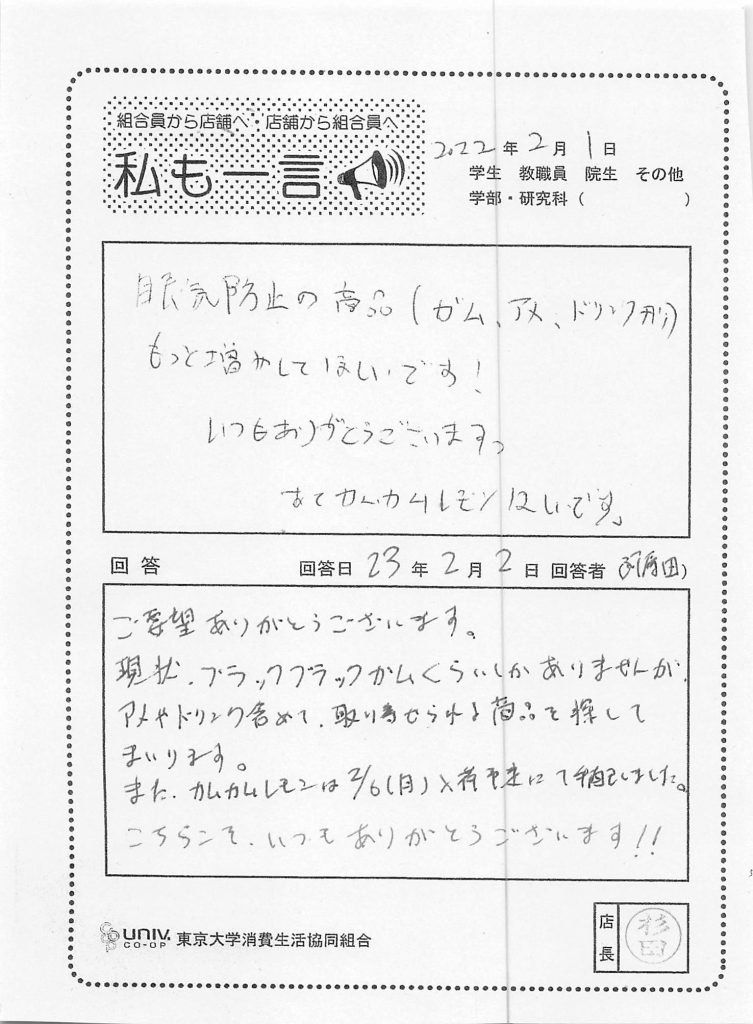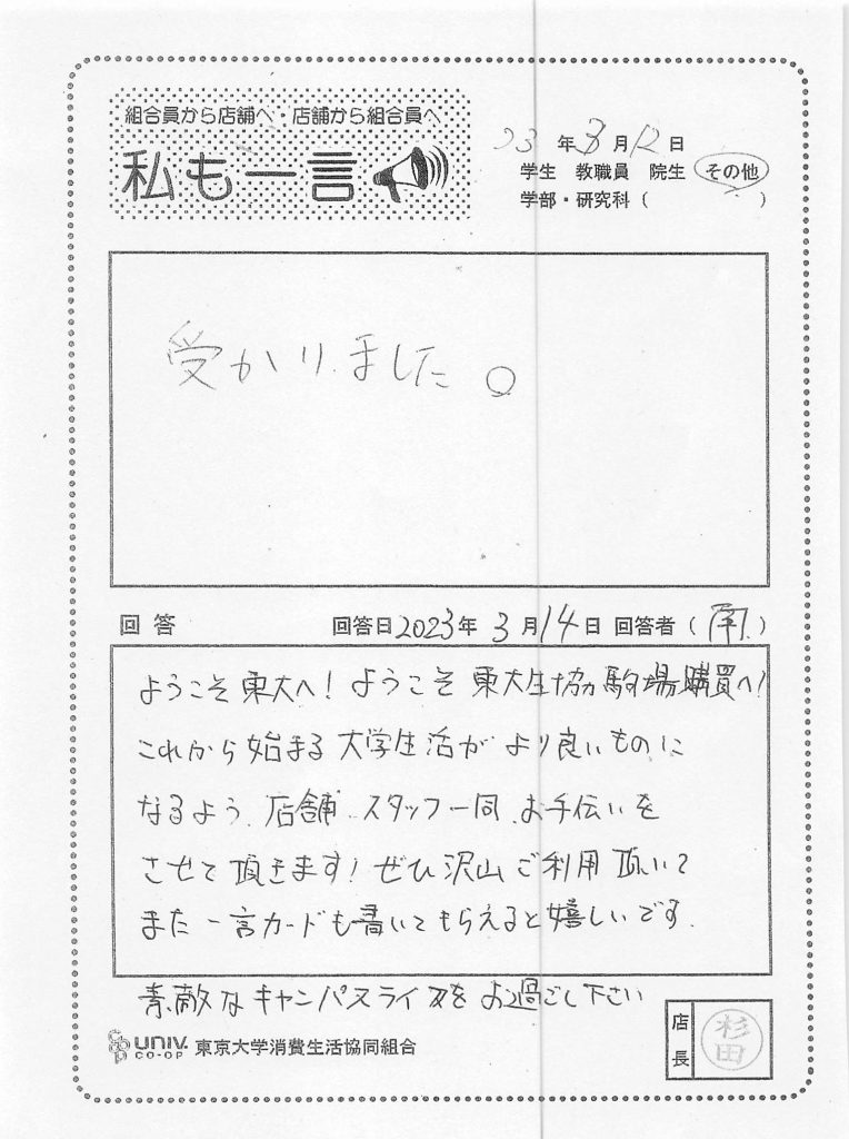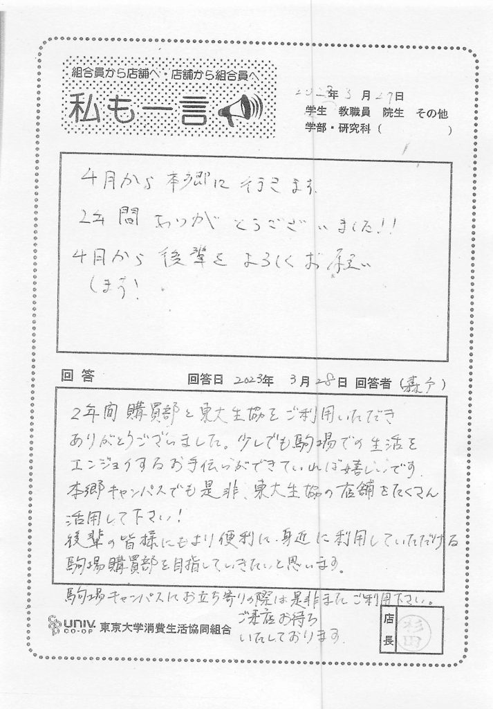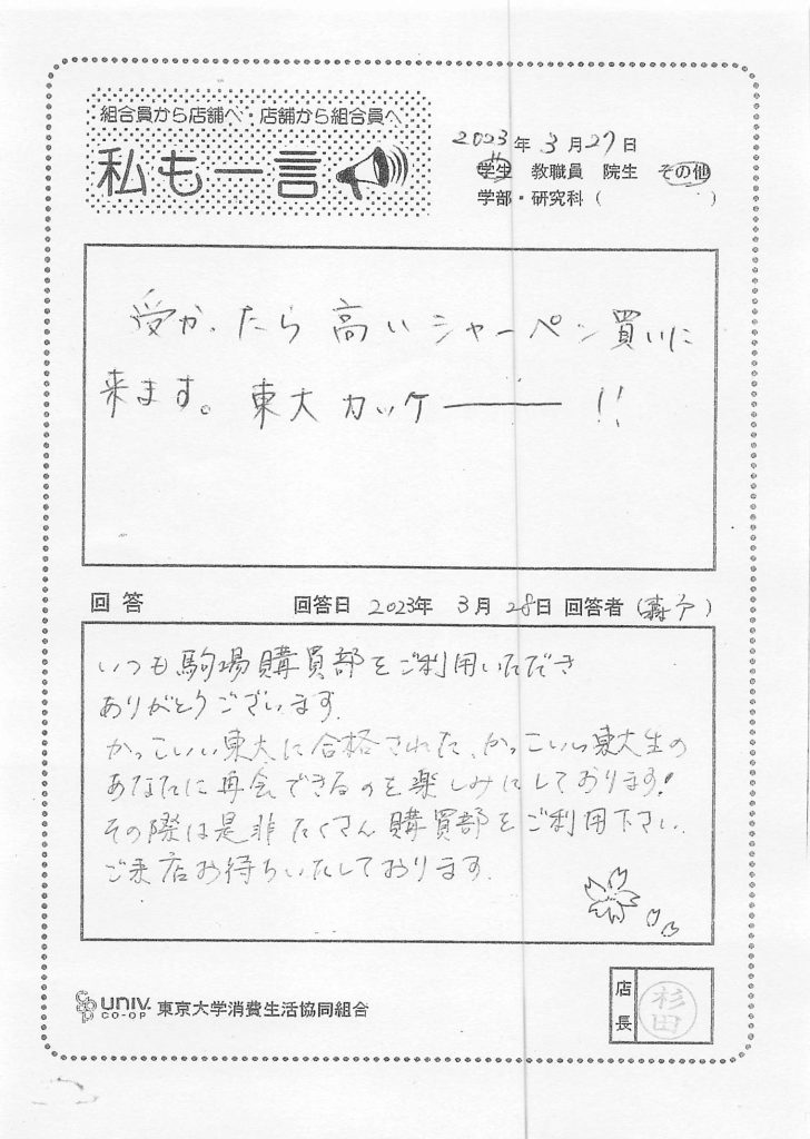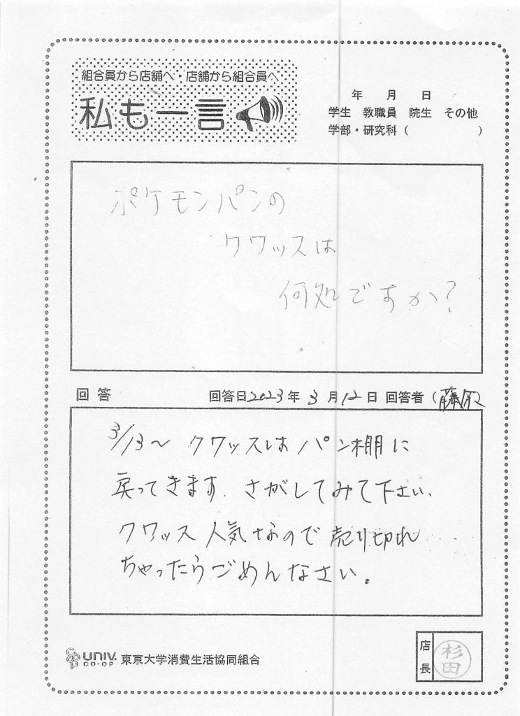オンライン投稿駒場購買 20234/18 入学記念の饅頭が品切れになっていましたが・・・ Q: 東大の入学記念の饅頭が品切れになっていましたが、次回の入荷が何時ごろになるか教えていただけませんか?よろしくお願いします。 A: 現在大學饅頭は、学園祭などのお客様が多数お越しいただく学事に合わせて期間限定の製造・販売となっております。 Tweet