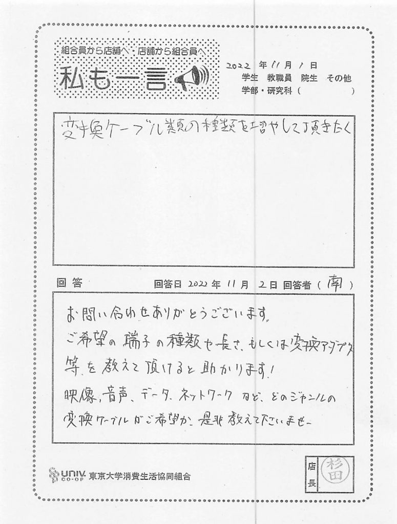 変換ケーブル類の種類を増やして頂きたく・・・